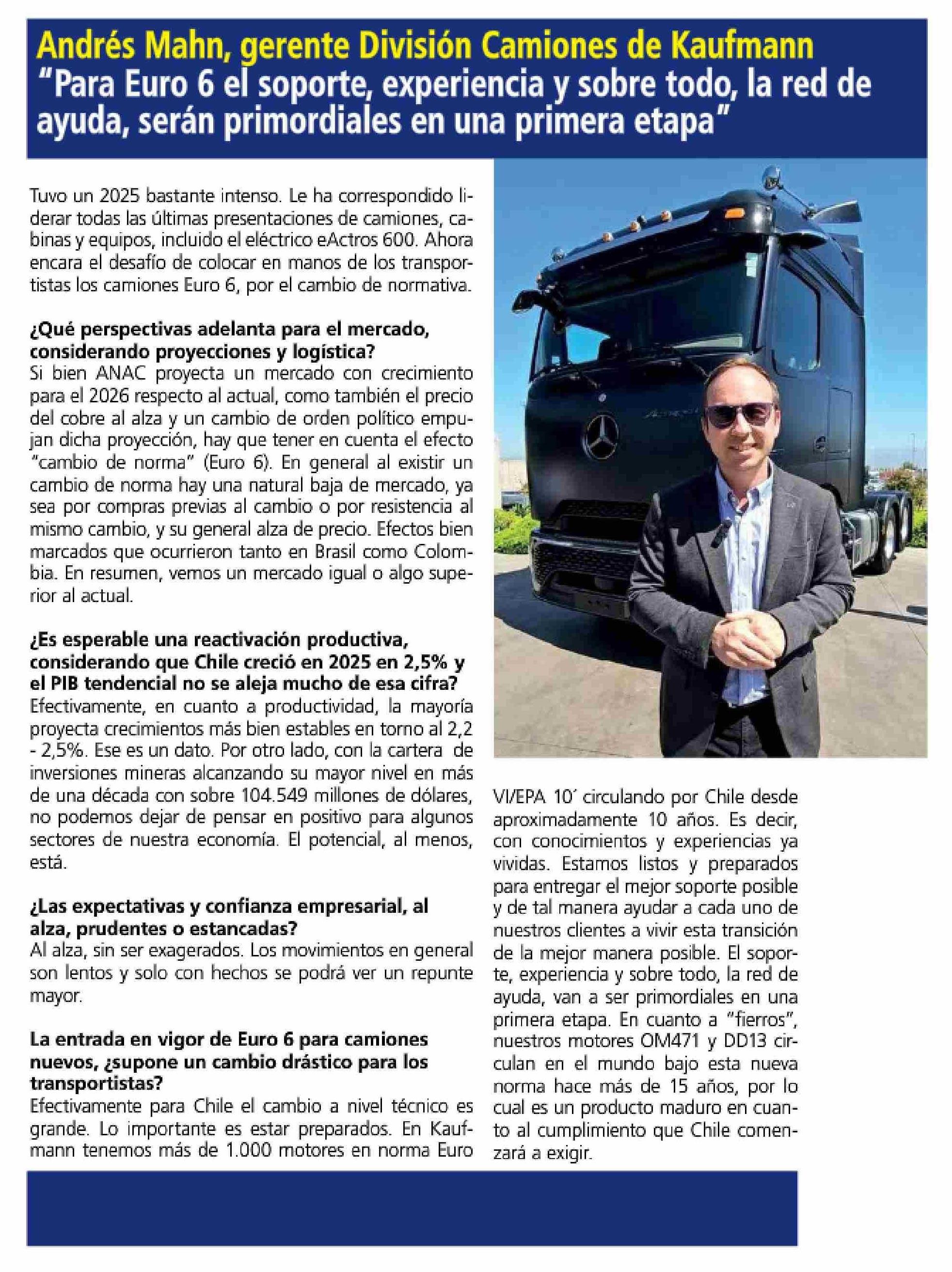 | Título: | Andrés Mahn, gerente División Camiones de Kaufmann "Para Euro 6 el soporte, experiencia y sobre todo, la red de ayuda, serán primordiales en una primera etapa” |