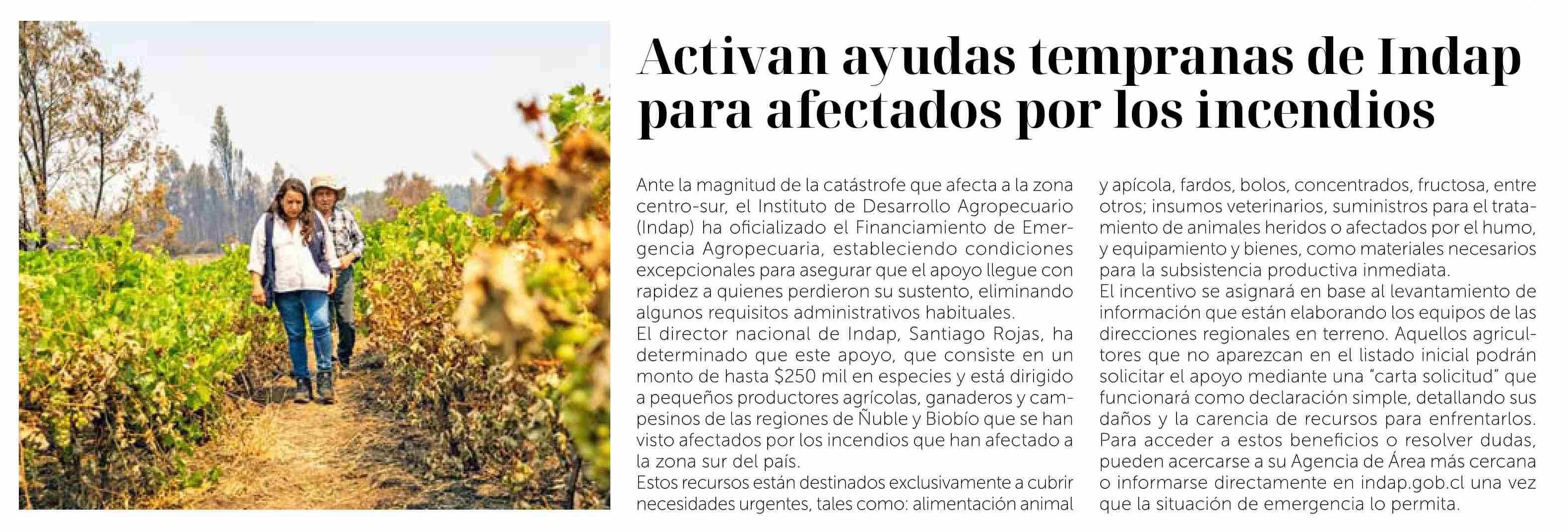 Activan ayudas tempranas de Indap para afectados por los incendios
