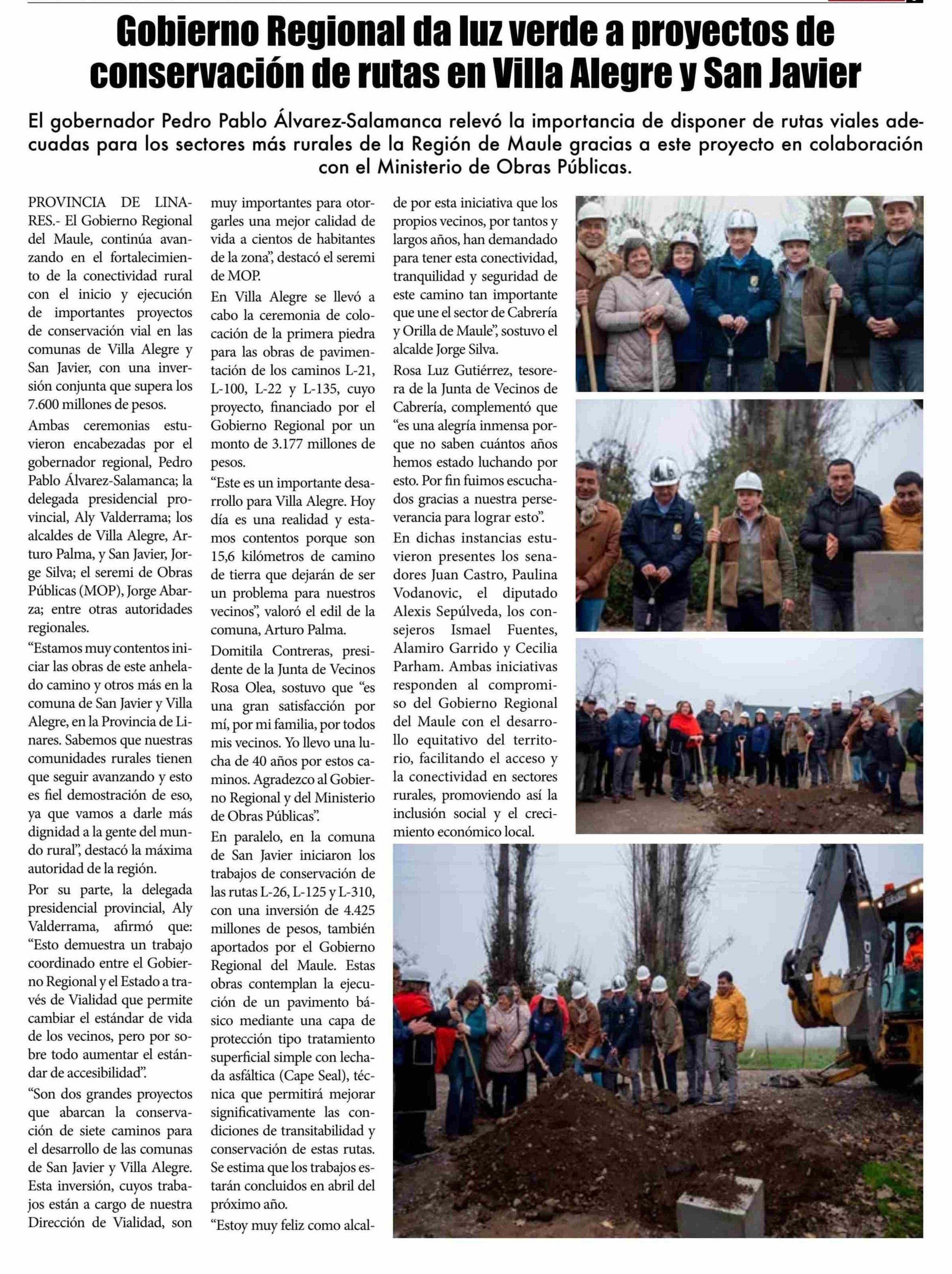 Título: Gobierno Regional da luz verde a proyectos de conservación de rutas en Villa Alegre y San Javier