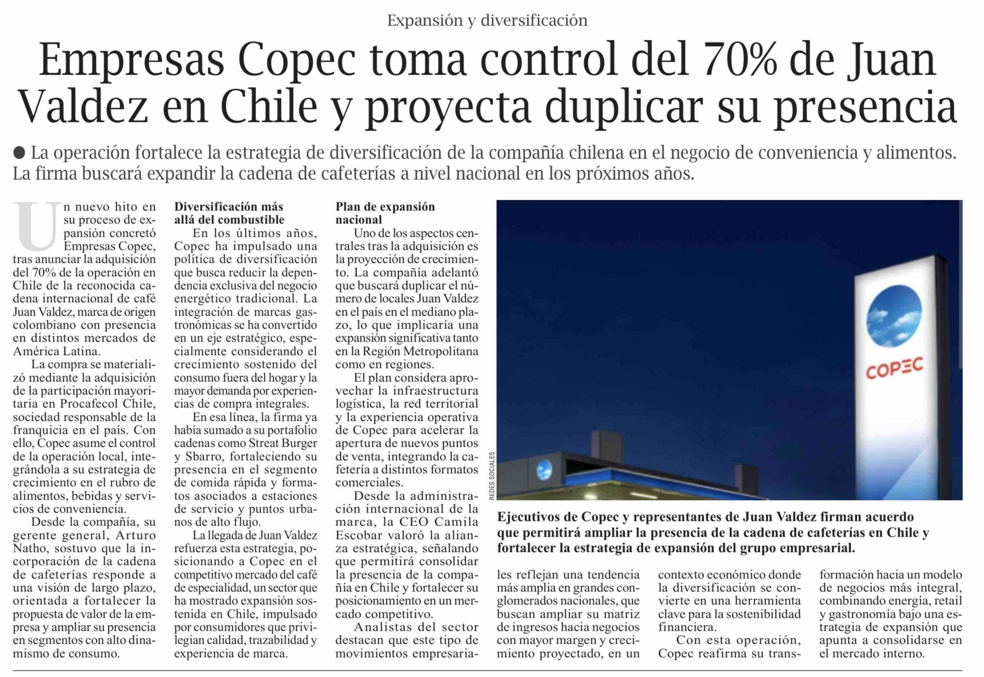 Empresas Copec toma control del 70% de Juan Valdez en Chile y proyecta duplicar su presencia