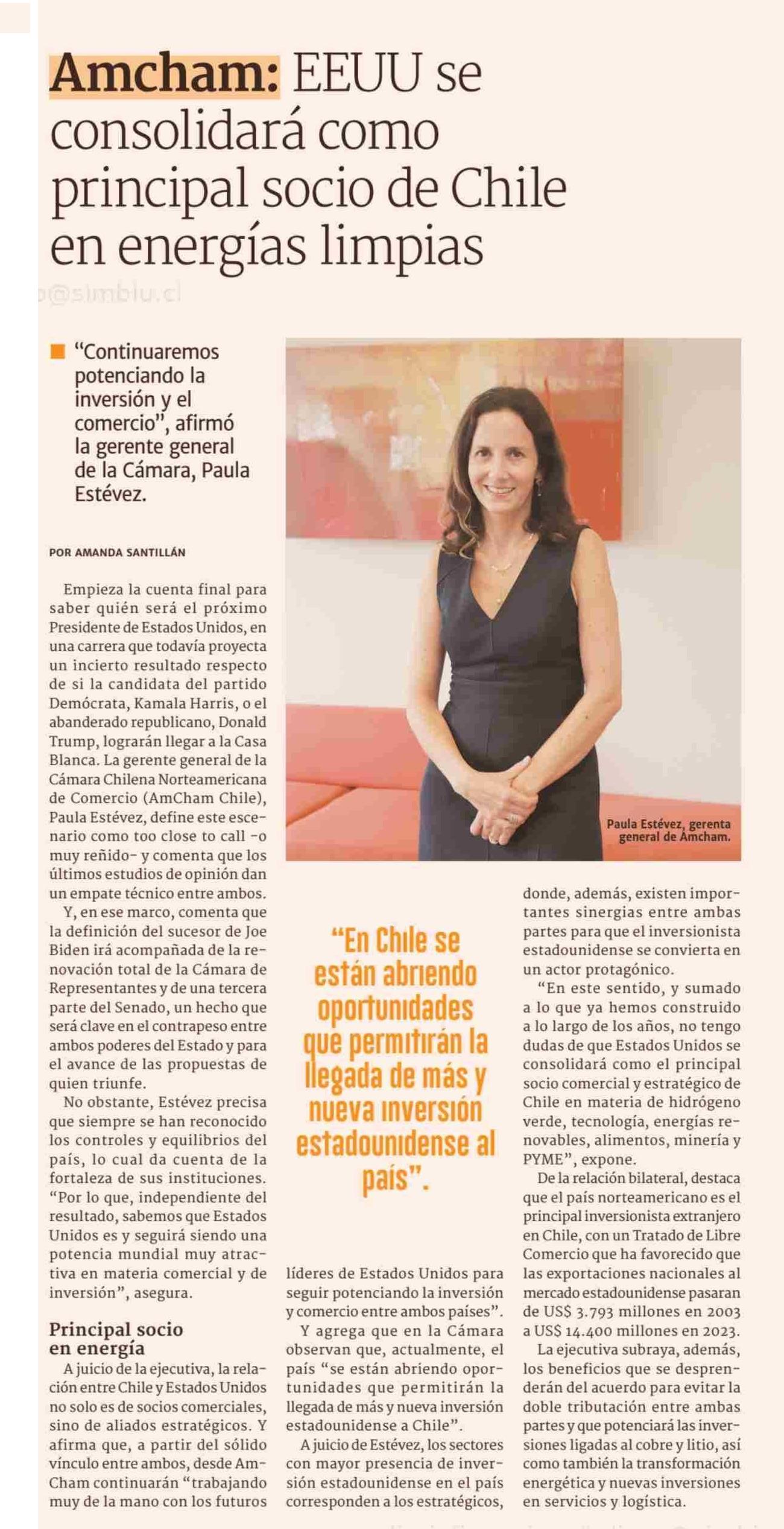 Amcham: EEUU se consolidará como principal socio de Chile en energías limpias