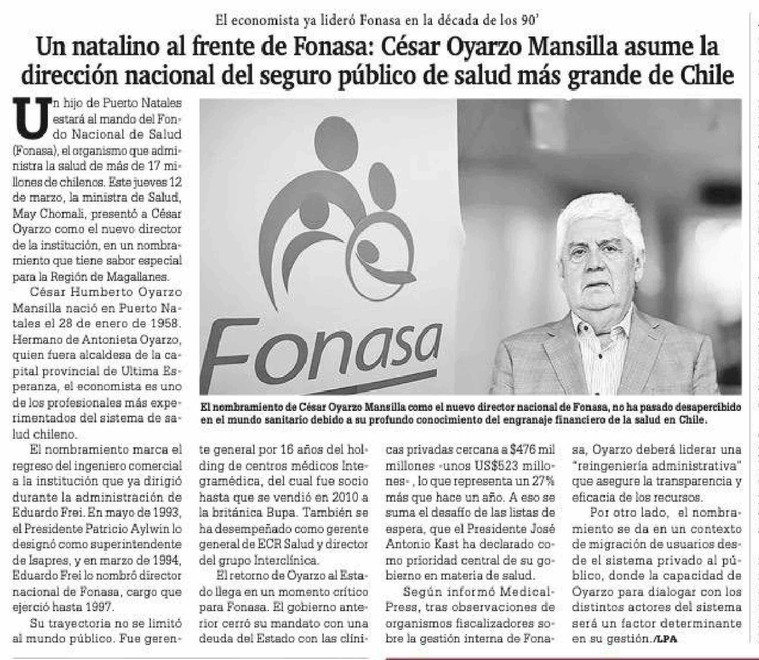 | Título: | Un natalino al frente de Fonasa: César Oyarzo Mansilla asume la dirección nacional del seguro público de salud más grande de Chile |