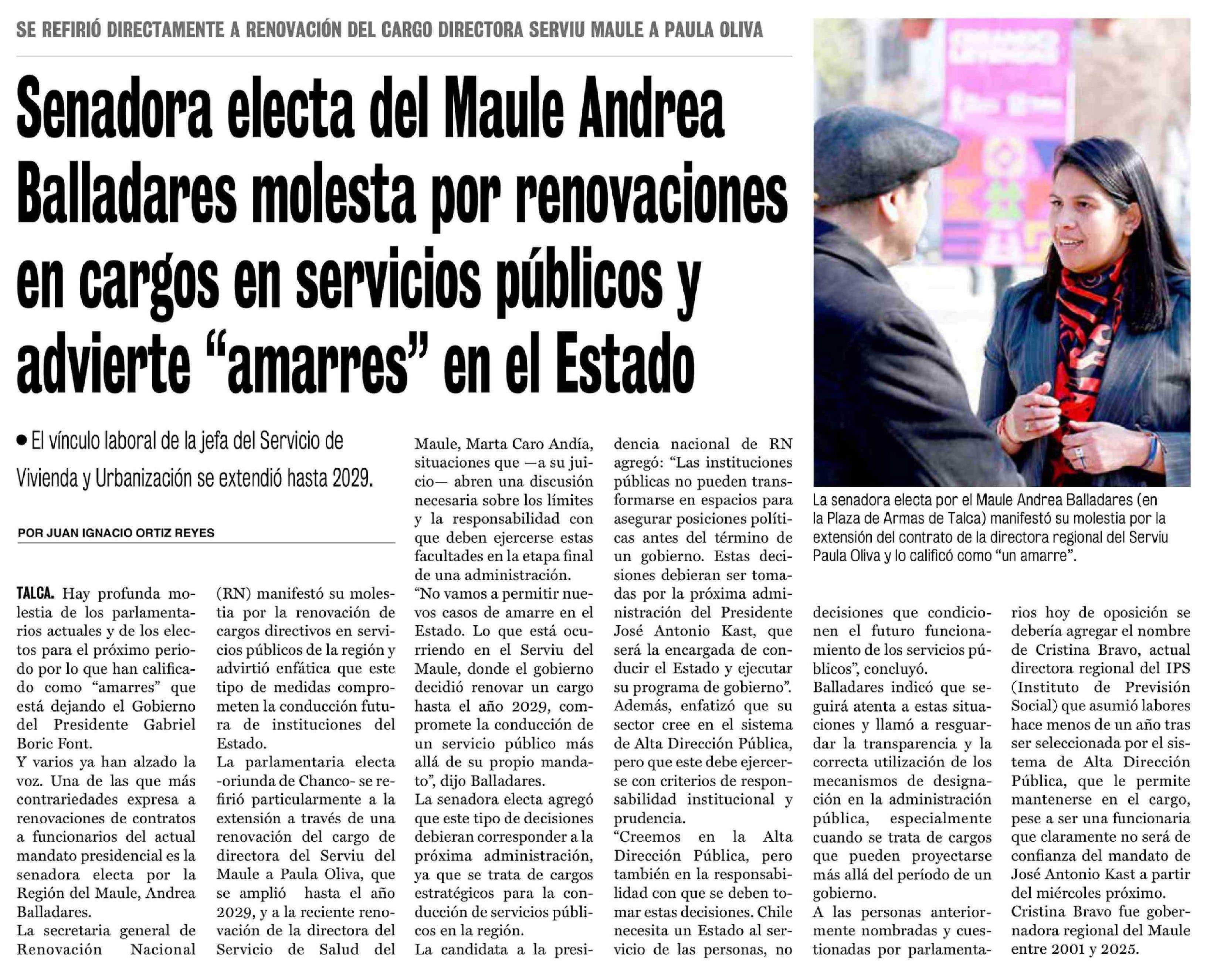 Senadora electa del Maule Andrea Balladares molesta por renovaciones en cargos en servicios públicos y advierte "amarres" en el Estado