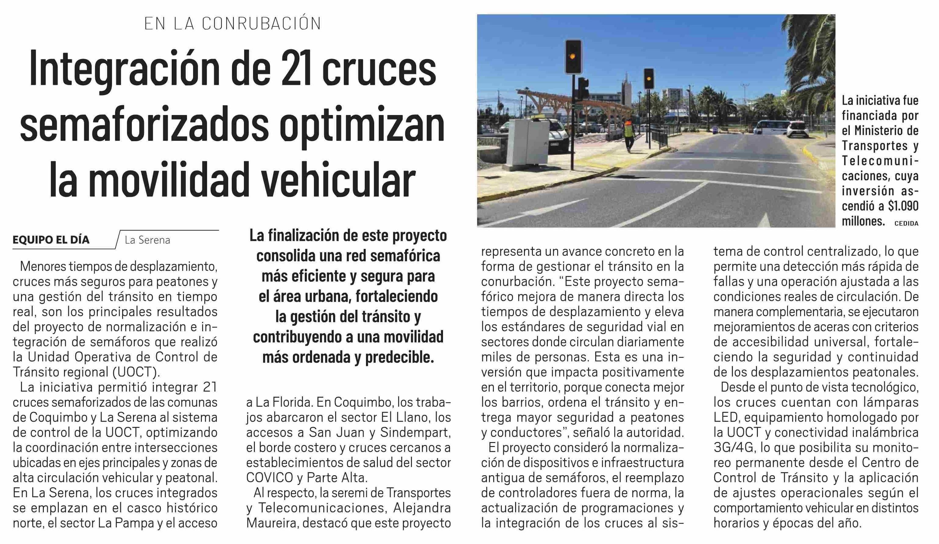 Integración de 21 cruces semaforizados optimizan la movilidad vehicular