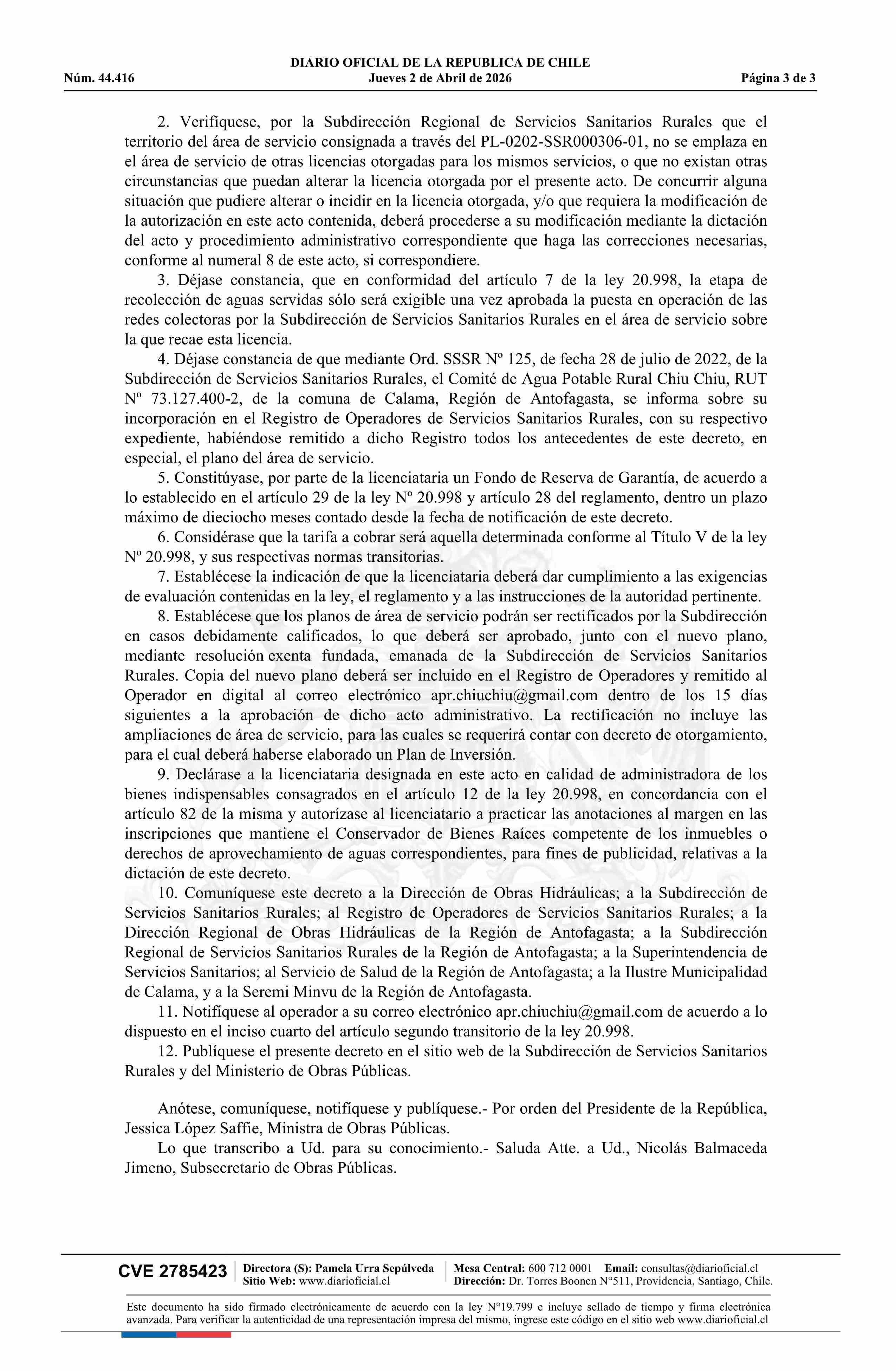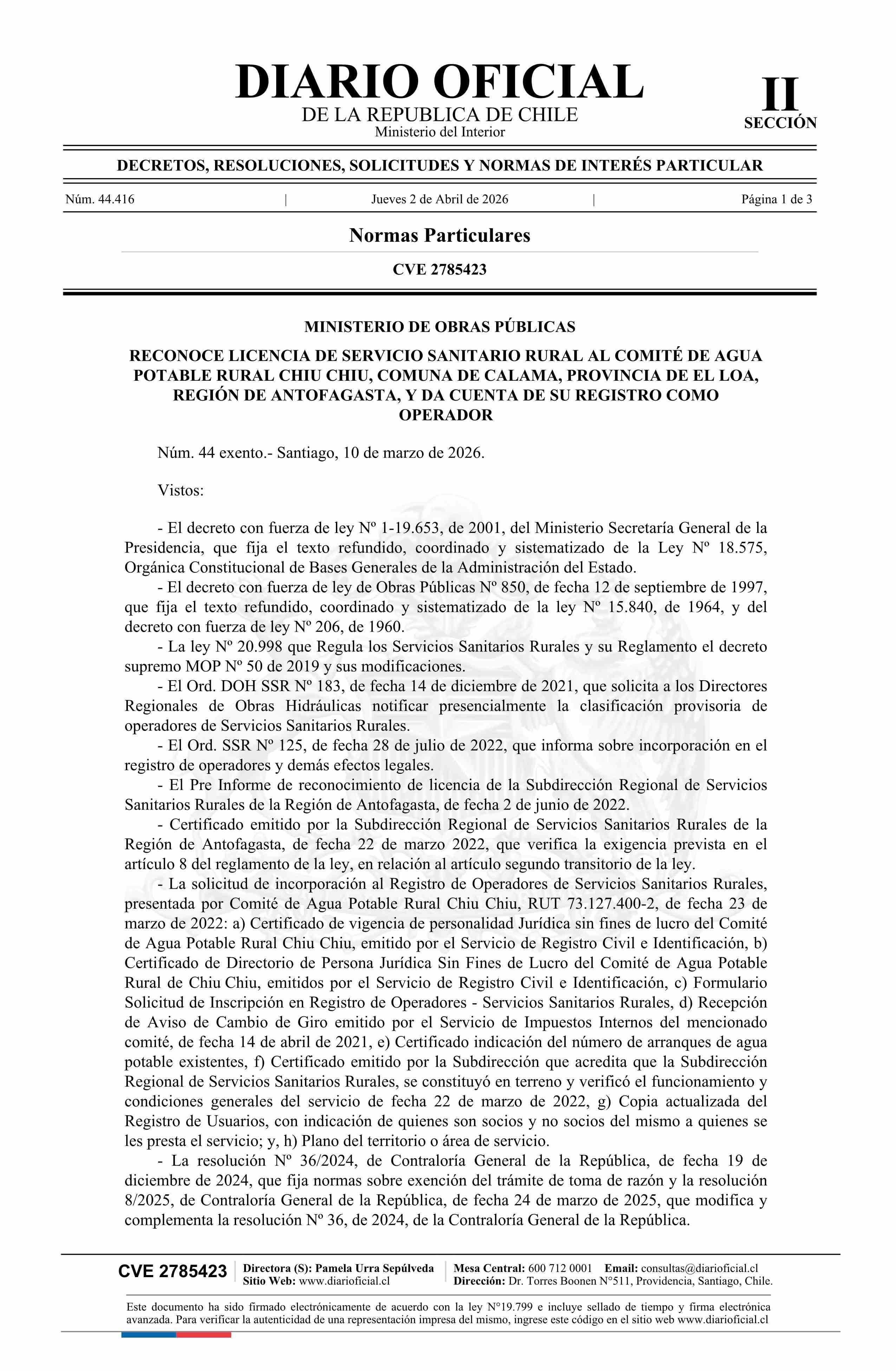 | Título: | Decreto exento número 44, de 2026.- Reconoce Licencia de Servicio Sanitario Rural al Comité de Agua Potable Rural Chiu Chiu, comuna de Calama, provincia de El Loa, Región de Antofagasta, y da cuenta de su registro como operador |
