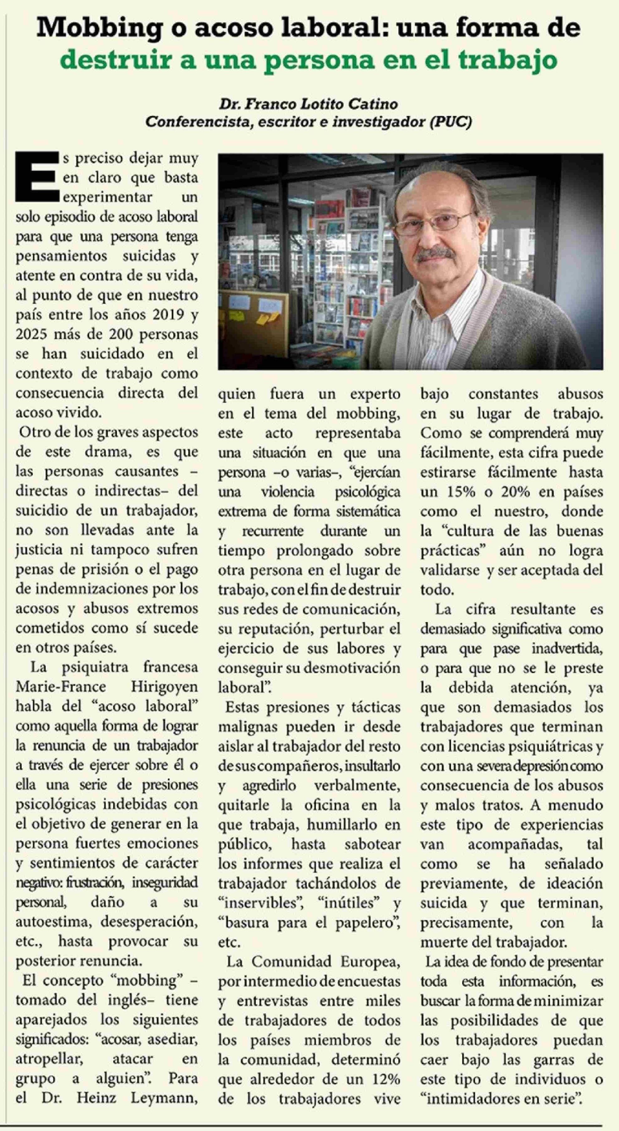 Columnas de Opinión: Mobbing o acoso laboral: una forma de destruir a una persona en el trabajo