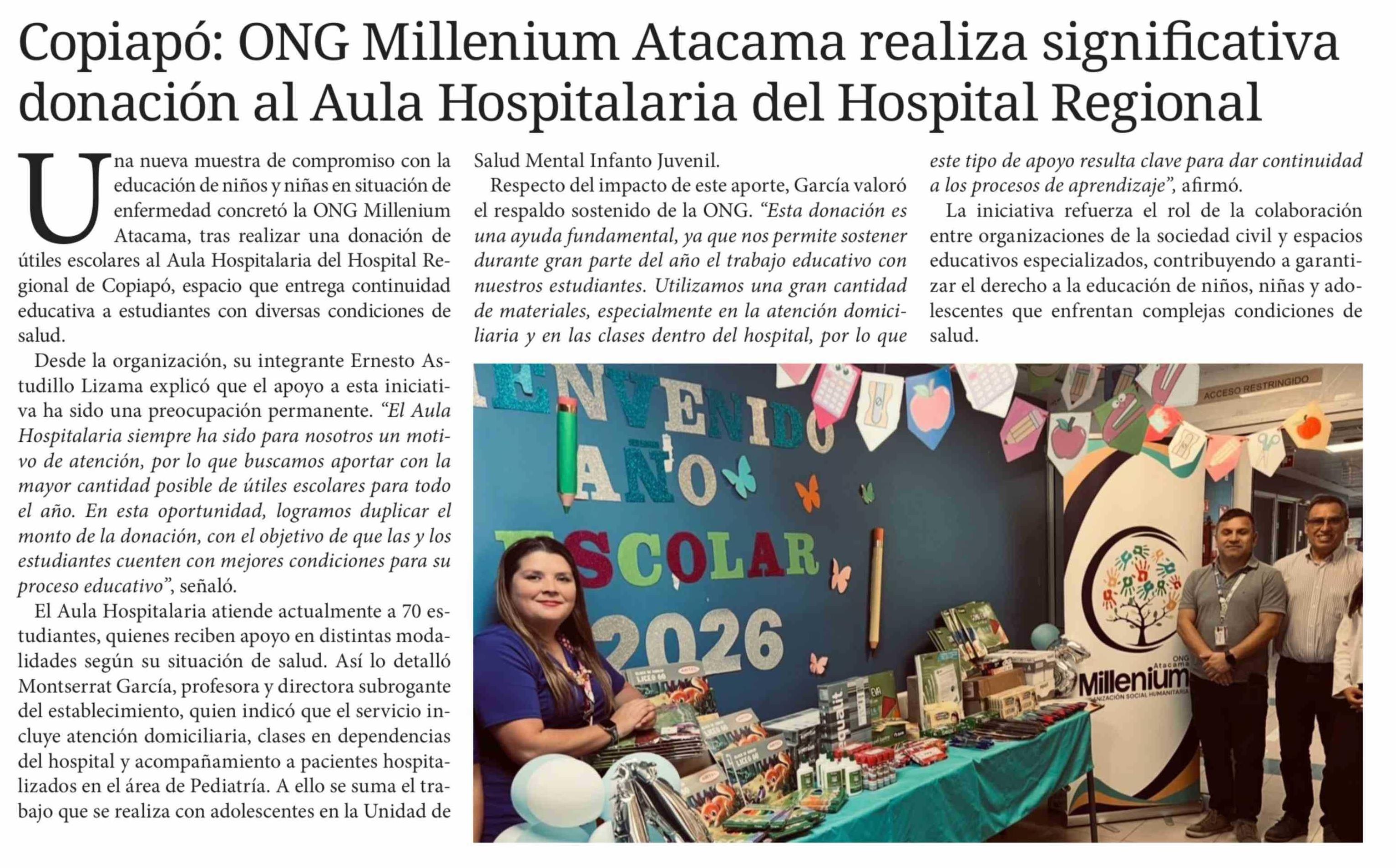 Copiapó: ONG Millenium Atacama realiza significativa donación al Aula Hospitalaria del Hospital Regional