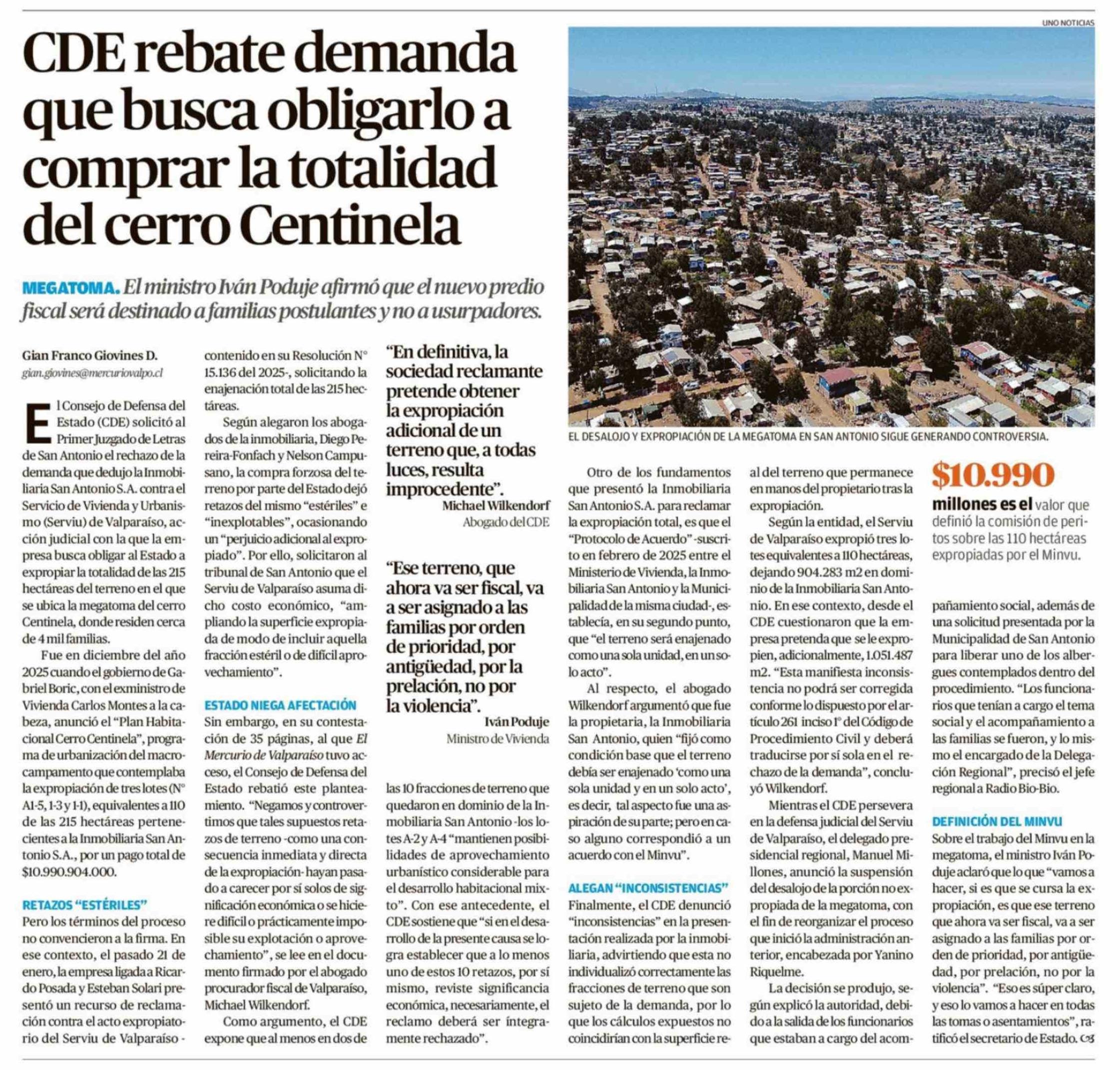 CDE rebate demanda que busca obligarlo a comprar la totalidad del cerro Centinela