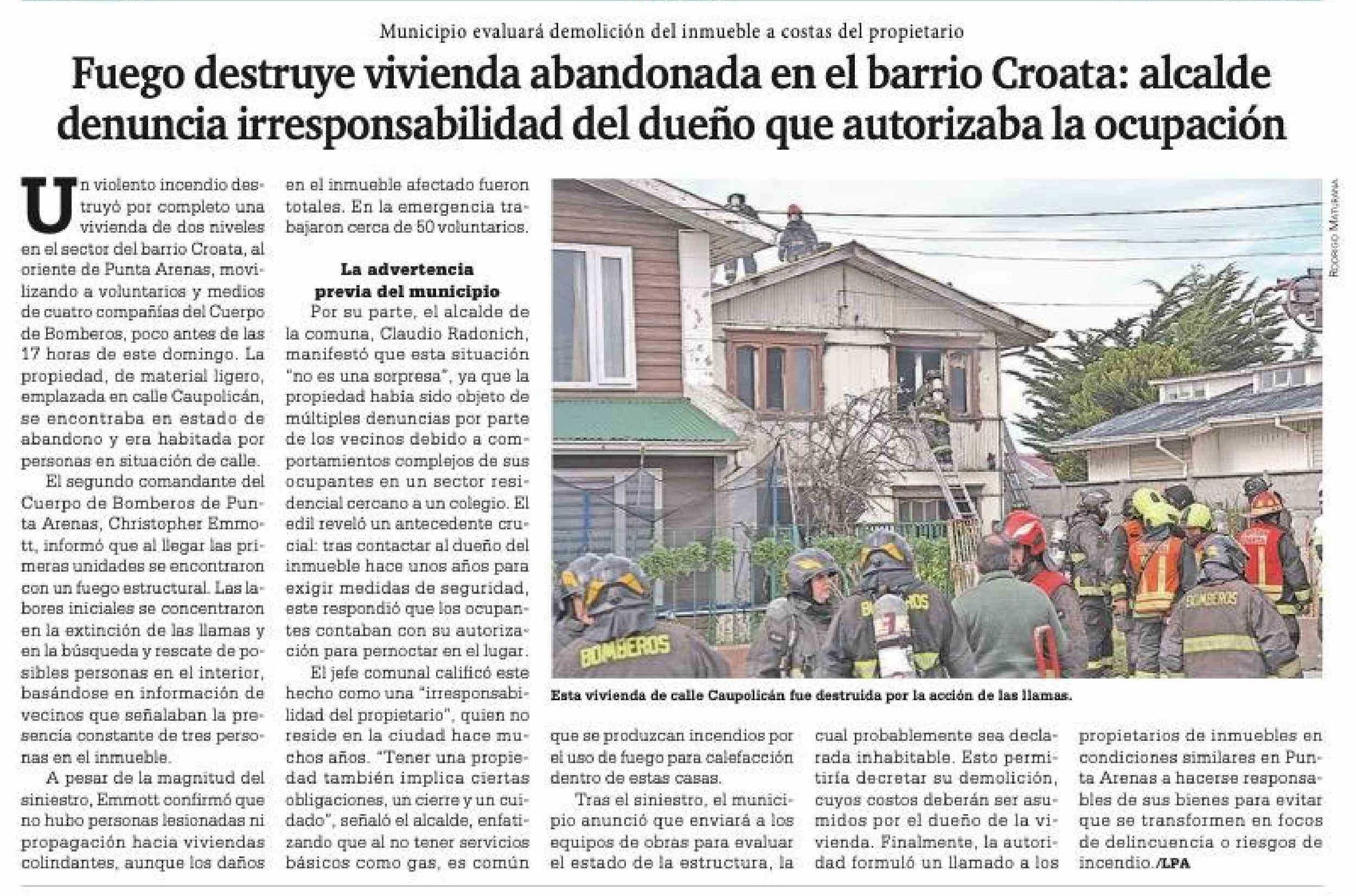 | Título: | Fuego destruye vivienda abandonada en el barrio Croata: alcalde denuncia irresponsabilidad del dueño que autorizaba la ocupación |