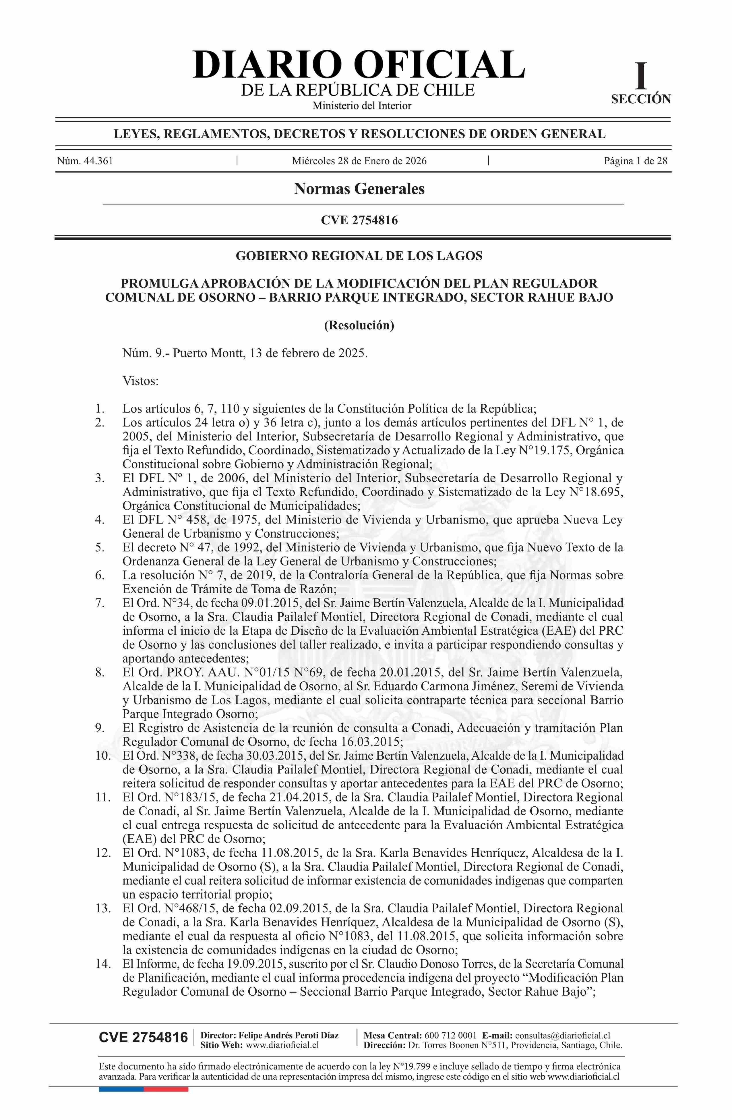 Título: Resolución número 9, de 2025.- Promulga aprobación de la modificación del Plan Regulador Comunal de Osorno - Barrio Parque Integrado, Sector Rahue Bajo