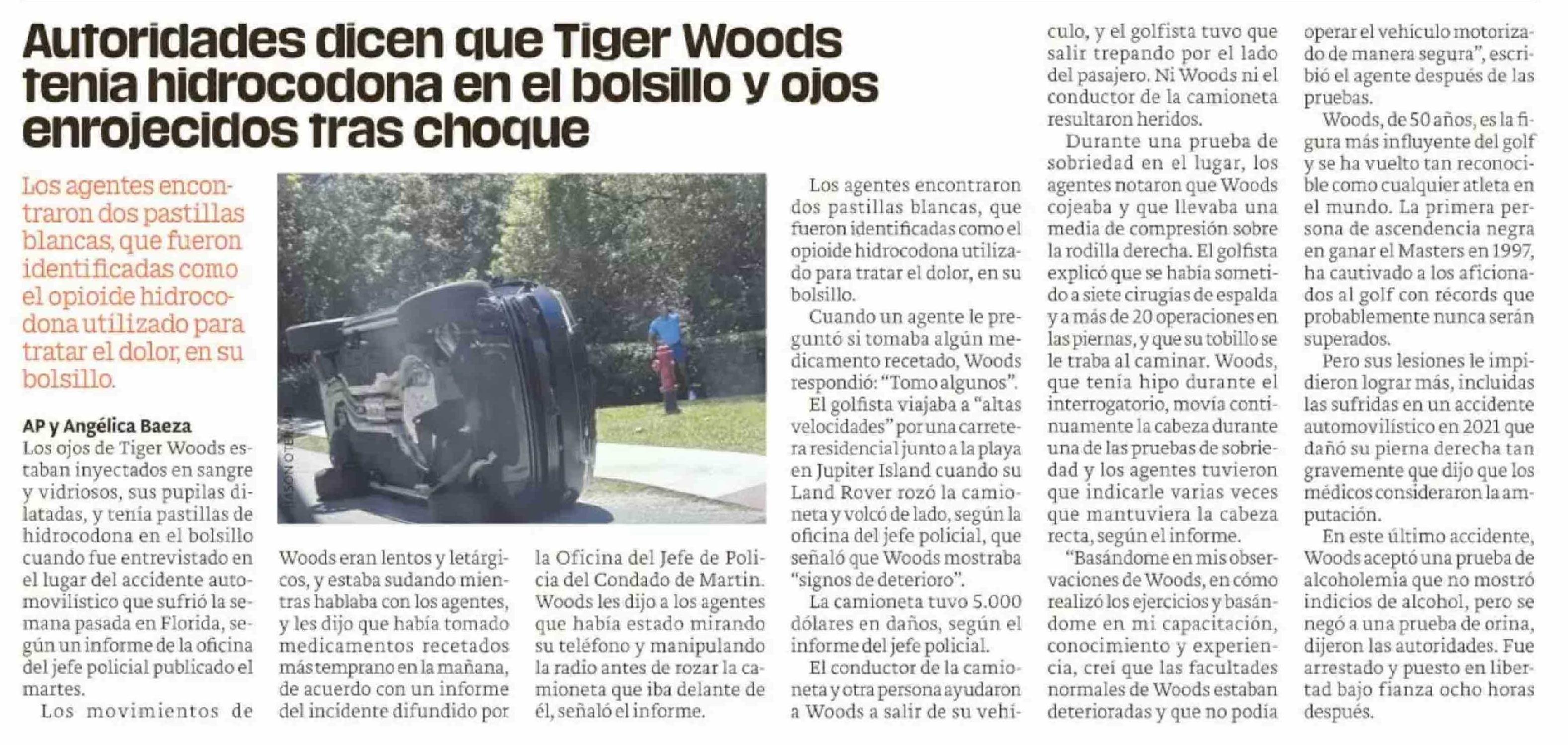 Título: Autoridades dicen que Tiger Woods tenia hidrocodona en el bolsillo y ojos enrojecidos tras choque
