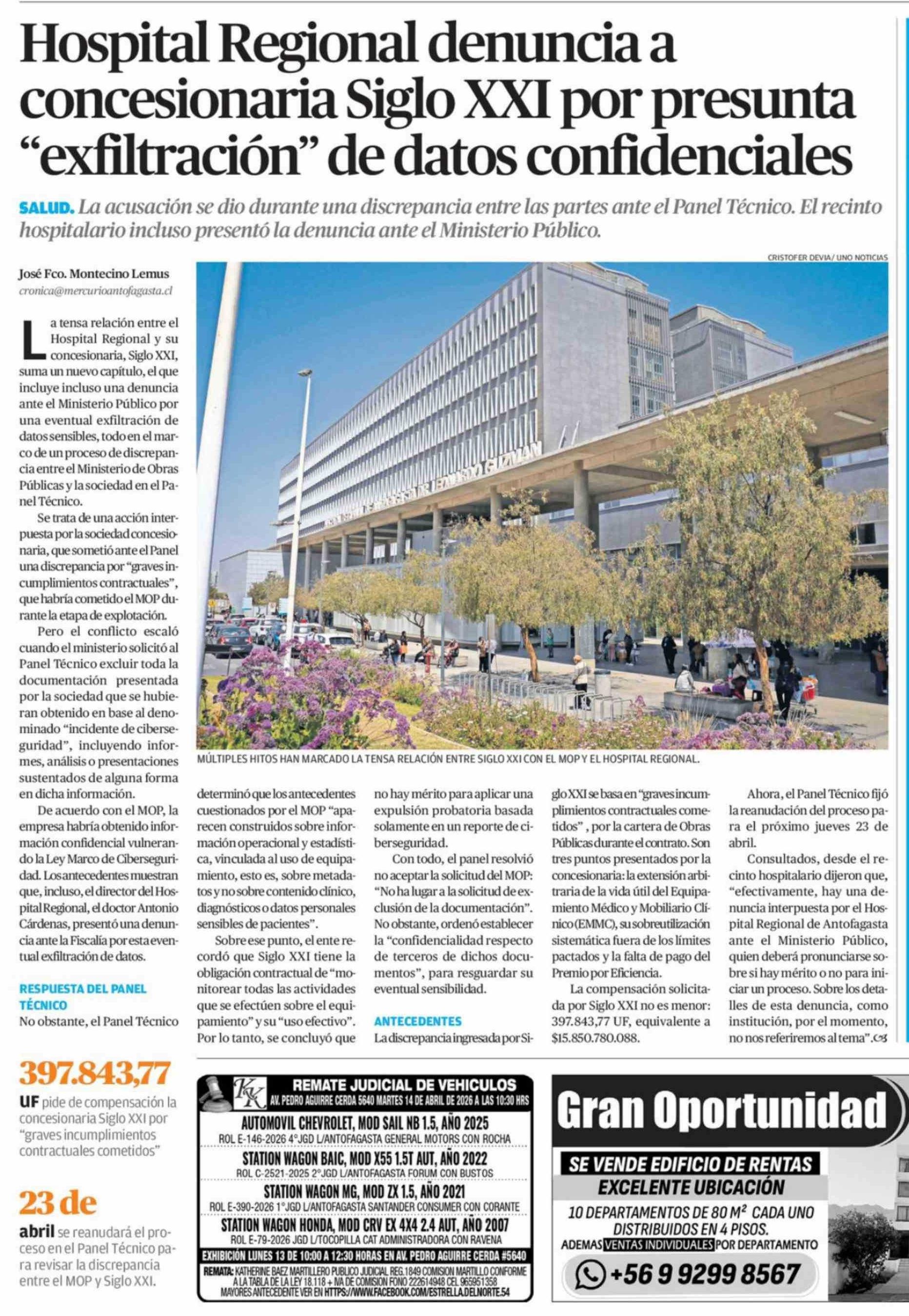 Título: Hospital Regional denuncia a concesionaria Siglo XXI por presunta "exfiltración" de datos confidenciales