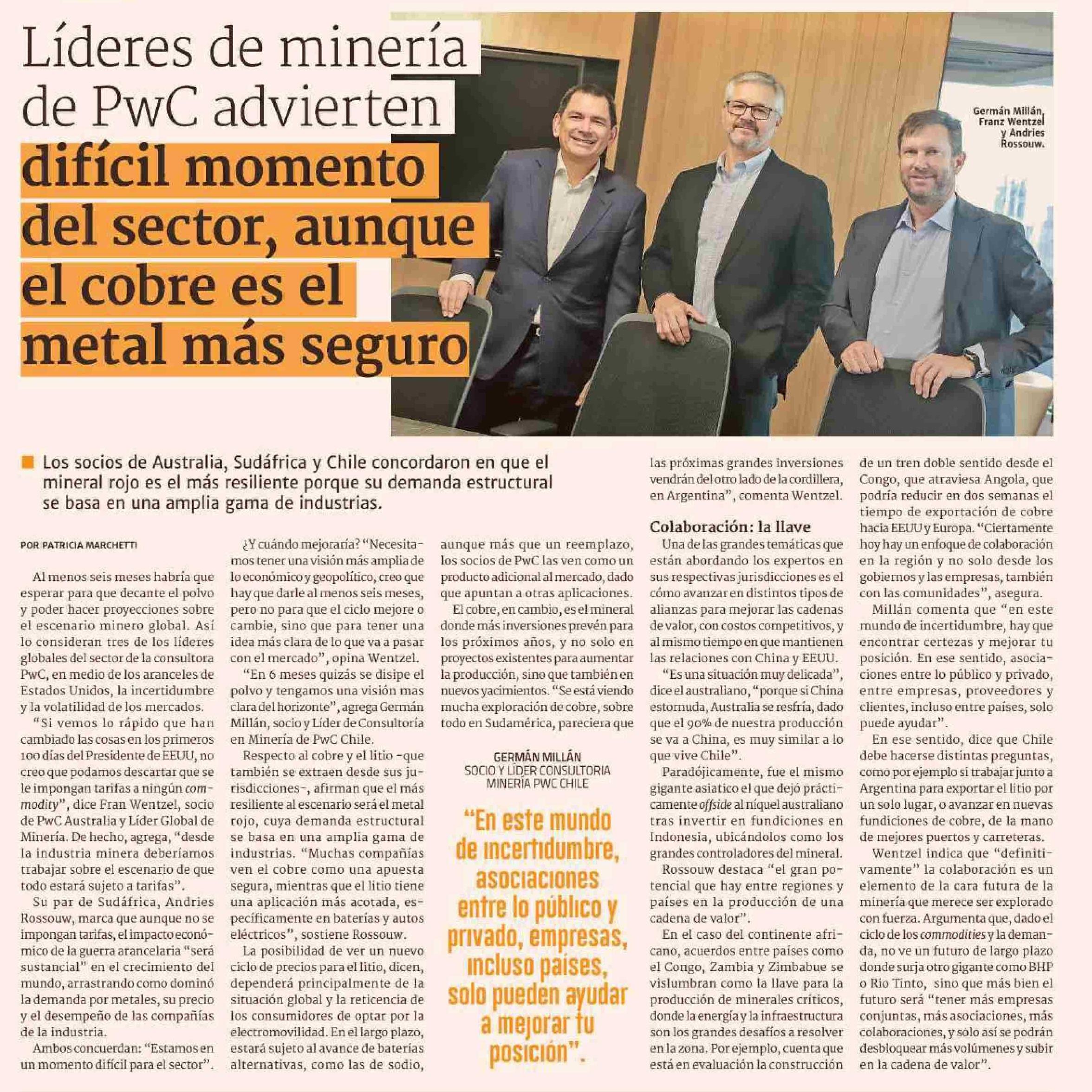 Líderes de minería de PwC advierten difícil momento del sector, aunque el cobre es el metal más seguro