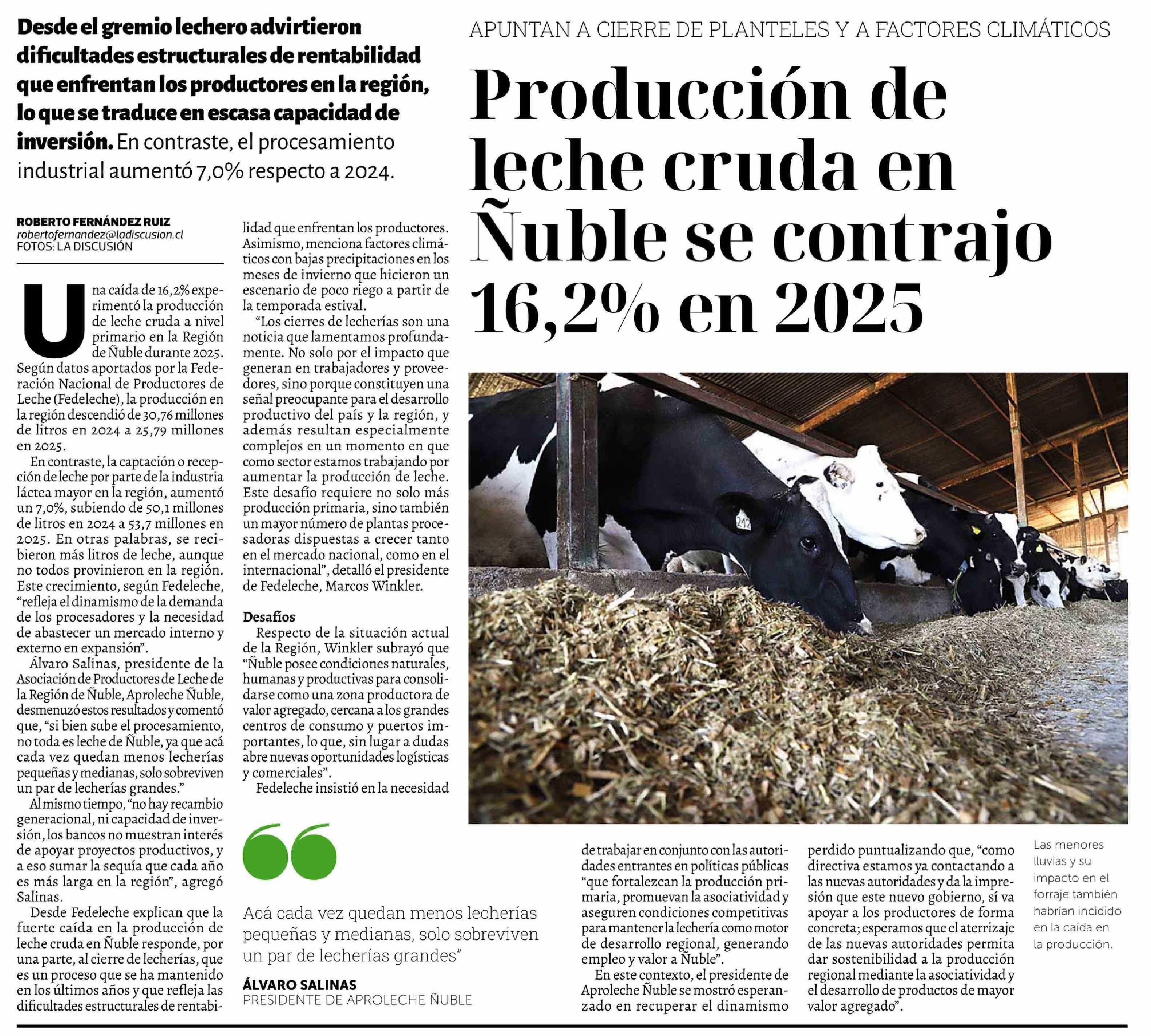 Producción de leche cruda en Ñuble se contrajo 16,2% en 2025