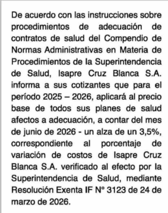 | Título: | Extractos: De acuerdo con las instrucciones sobre procedimientos de adecuación de contratos de salud del Compendio de Normas Administrativas en Materia de Procedimientos de la Superintendencia de Salud, Isapre Cruz Blanca S.A. informa a sus cotizantes que para el período 2025 - 2026, aplicará al pre |