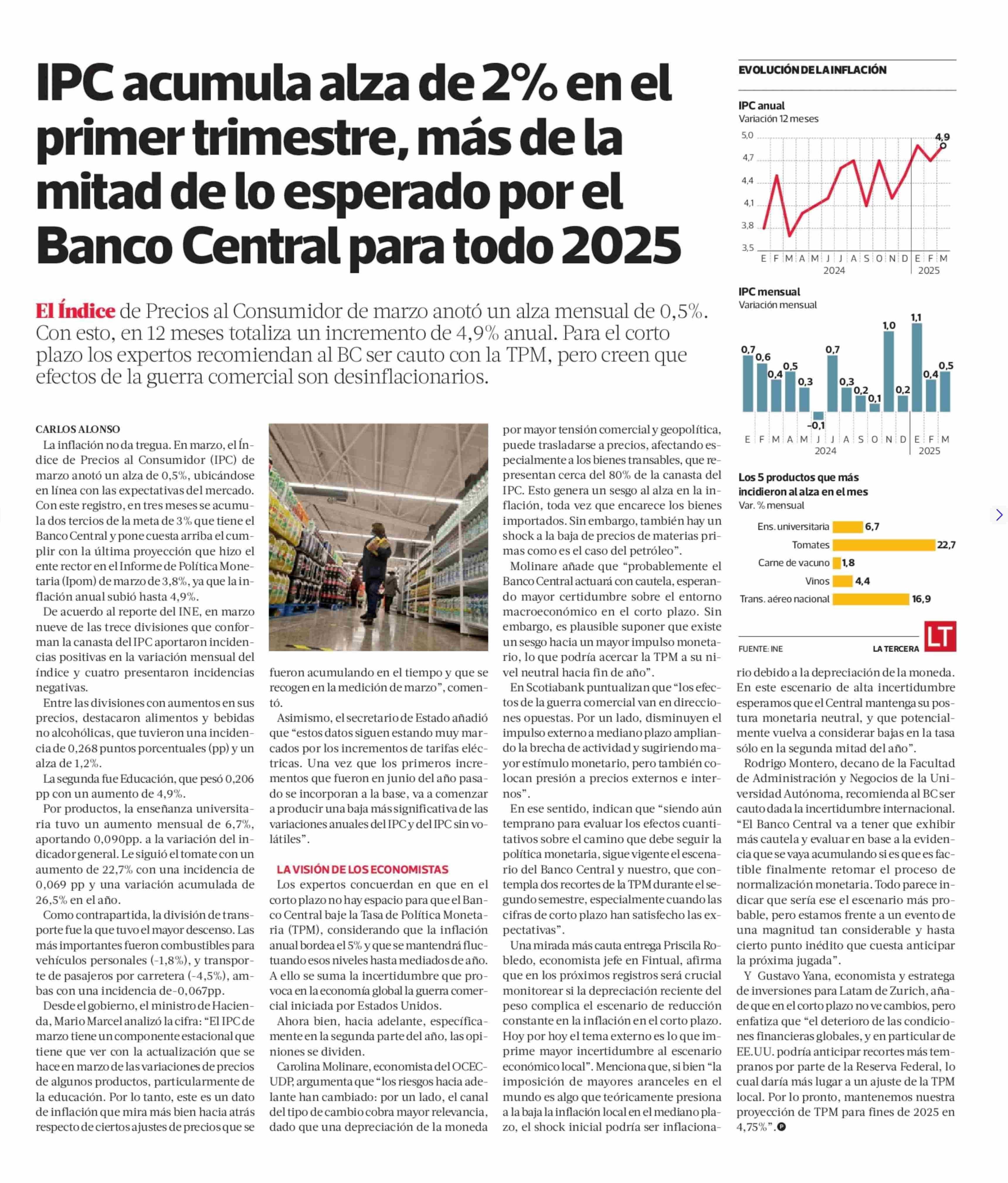 IPC acumula alza de 2% en el primer trimestre, más de la mitad de lo esperado por el Banco Central para todo 2025