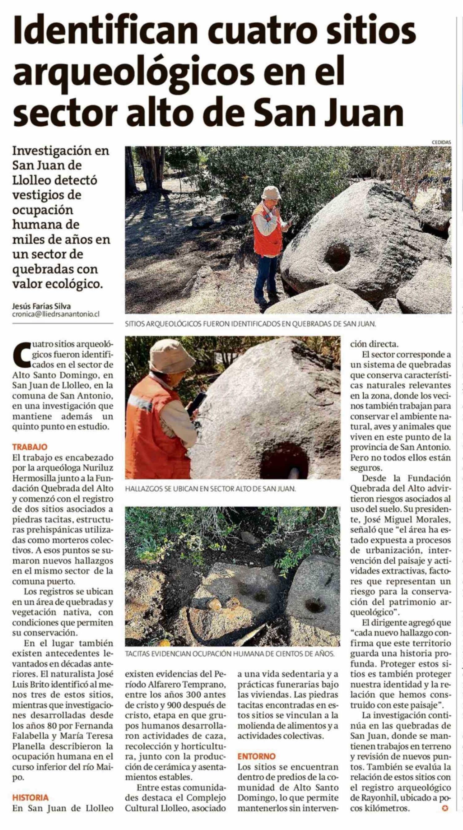 Identifican cuatro sitios arqueológicos en el sector alto de San Juan