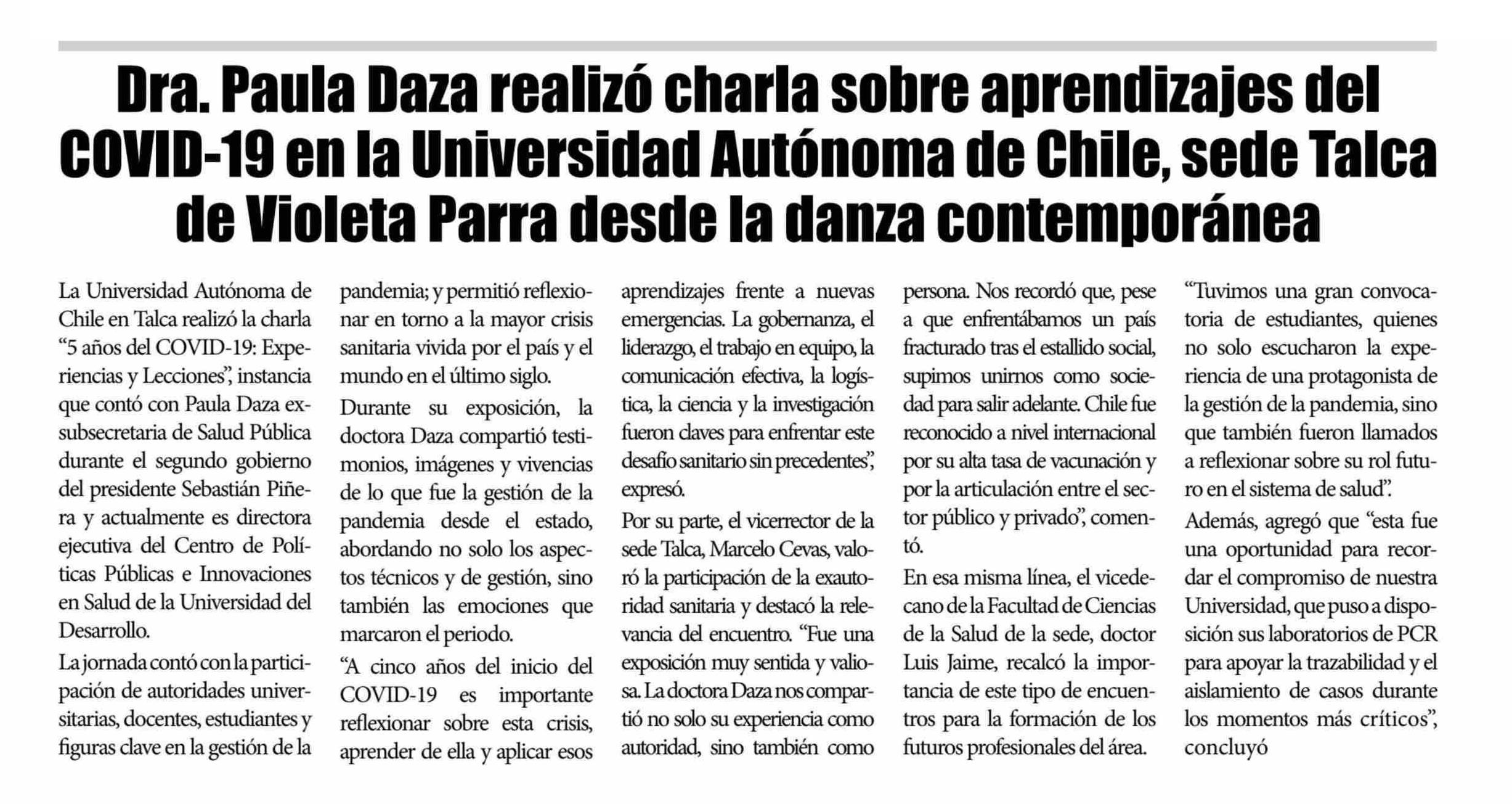 Dra. Paula Daza realizó charla sobre aprendizajes del COVID-19 en la Universidad Autónoma de Chile, sede Talca de Violeta Parra desde la danza contemporánea