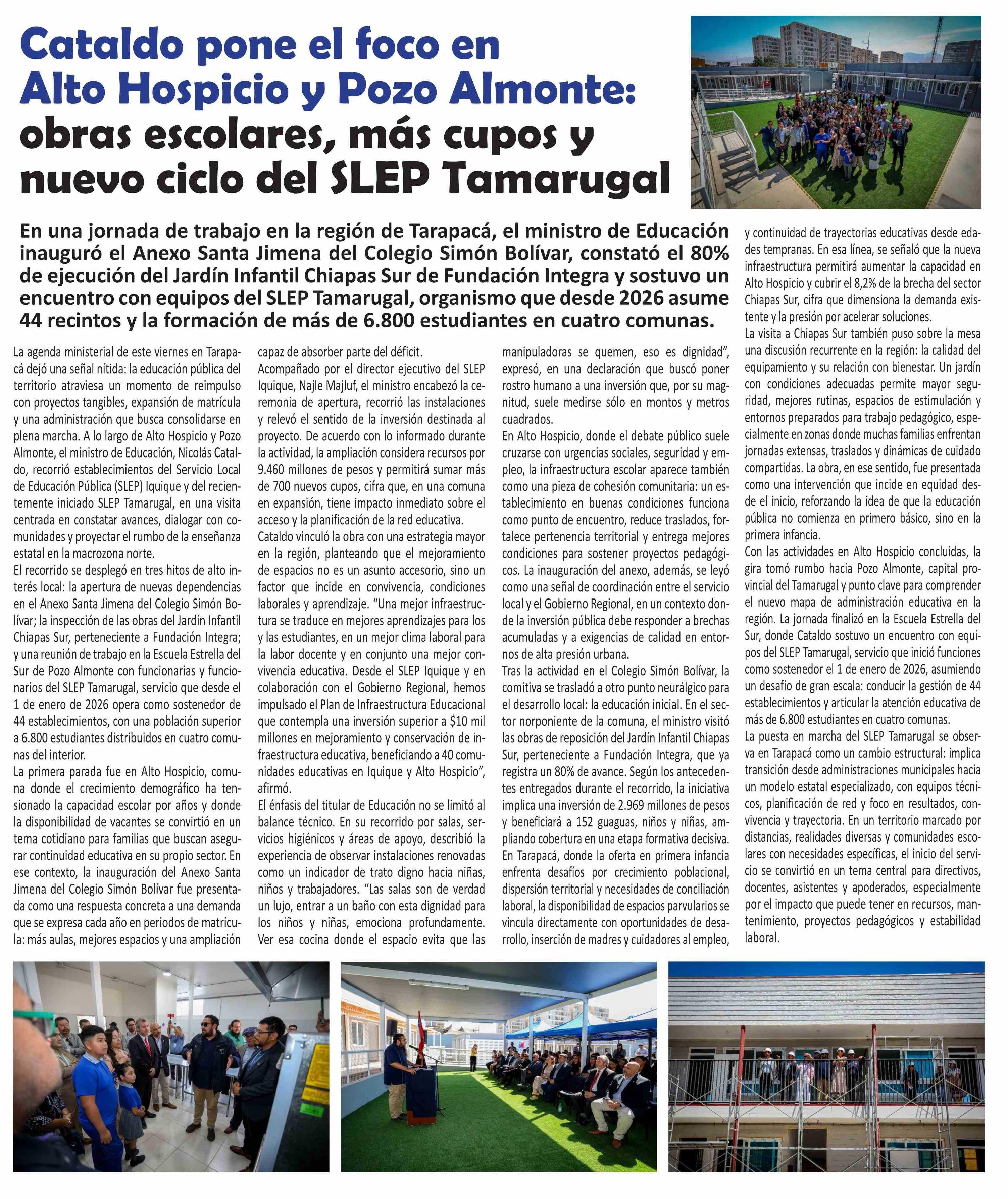 Cataldo pone el foco en Alto Hospicio y Pozo Almonte: obras escolares, más cupos y nuevo ciclo del SLEP Tamarugal