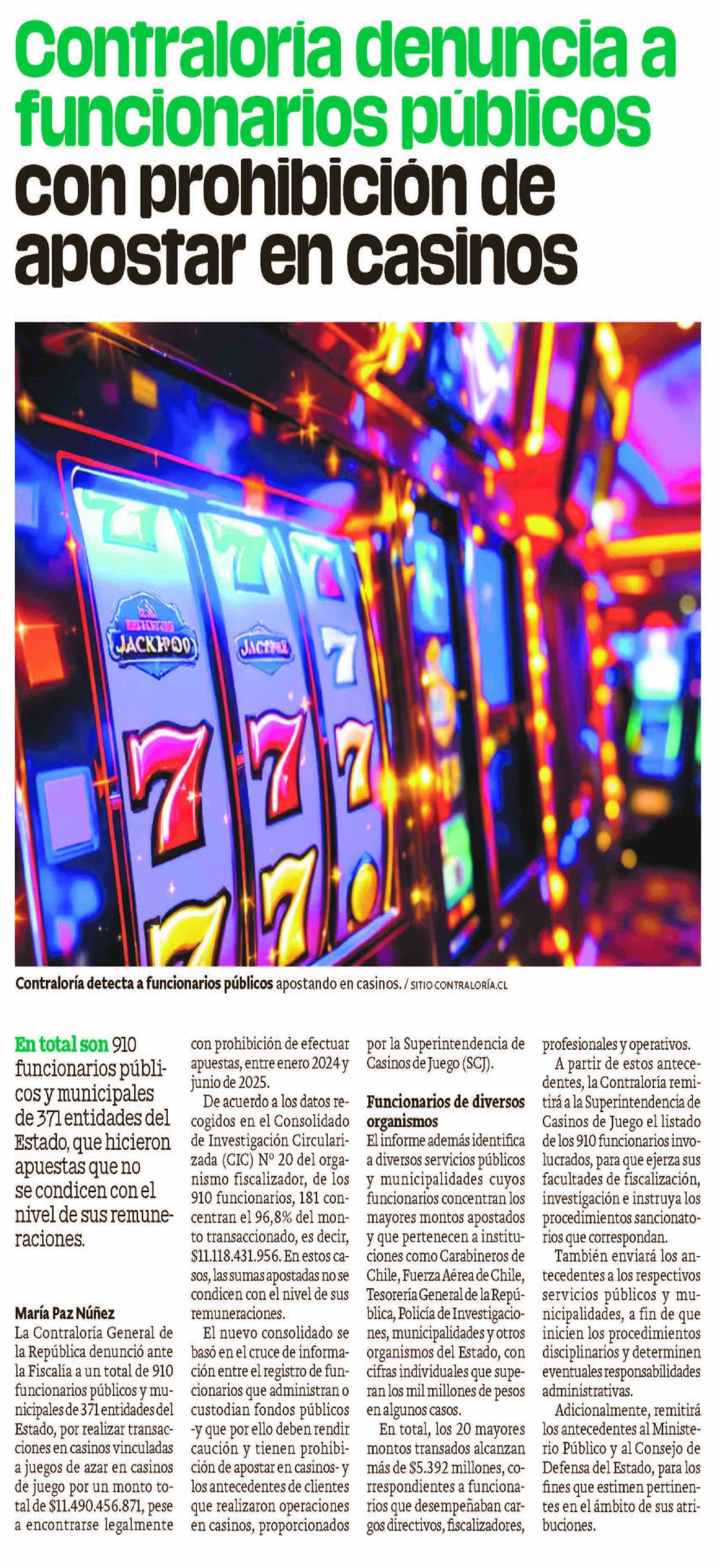 Contraloria denuncia a funcionarios públicos con prohibición de apostar en casinos