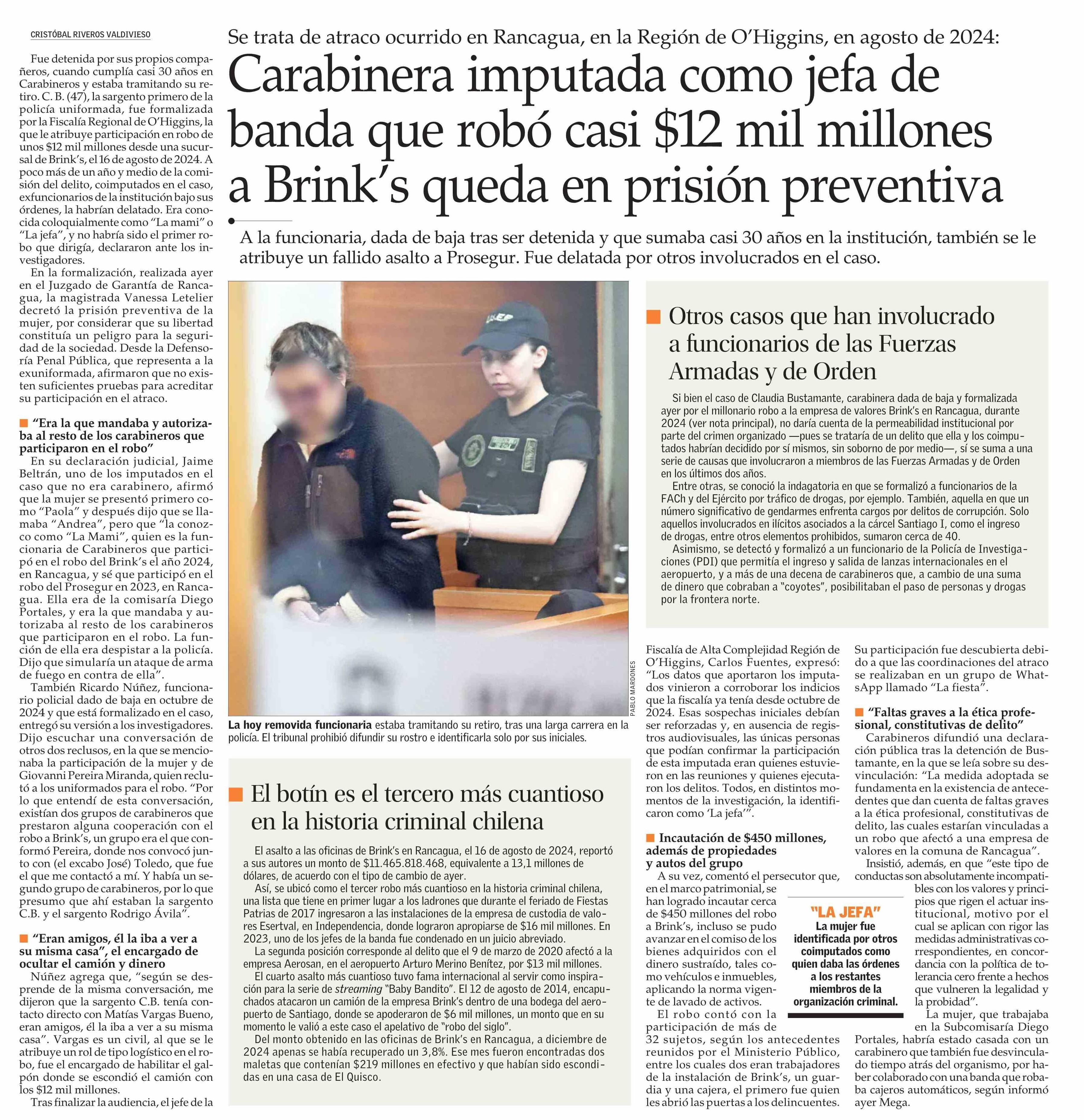 Carabinera imputada como jefa de banda que robó casi $12 mil millones a Brink's queda en prisión preventiva