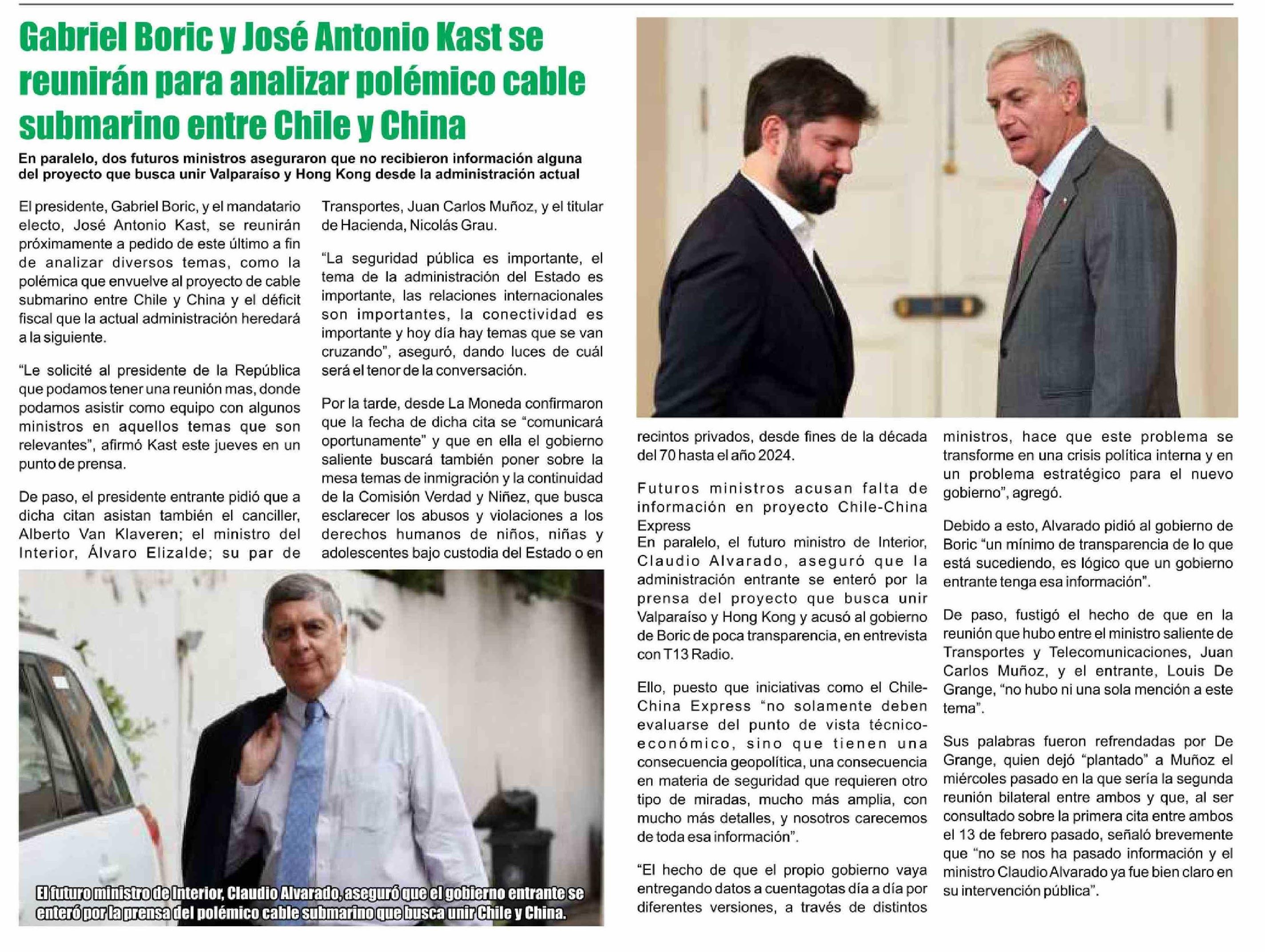 | Título: | El presidente, Gabriel Boric, y el mandatario electo, José Antonio Kast, se reunirán próximamente a pedido de este último a fin de analizar diversos temas, como la polémica que envuelve al proyecto de cable submarino entre Chile y China y el déficit fiscal que la actual administración heredará a la |