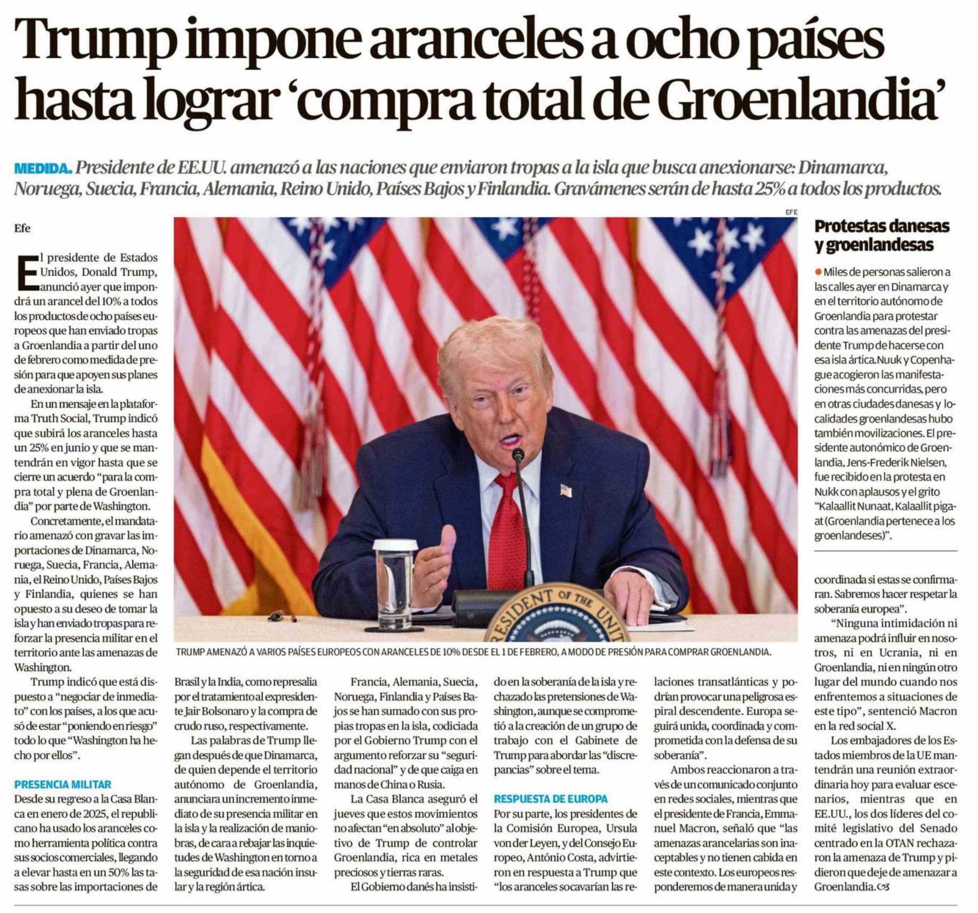 Trump impone aranceles a ocho países hasta lograr 'compra total de Groenlandia'