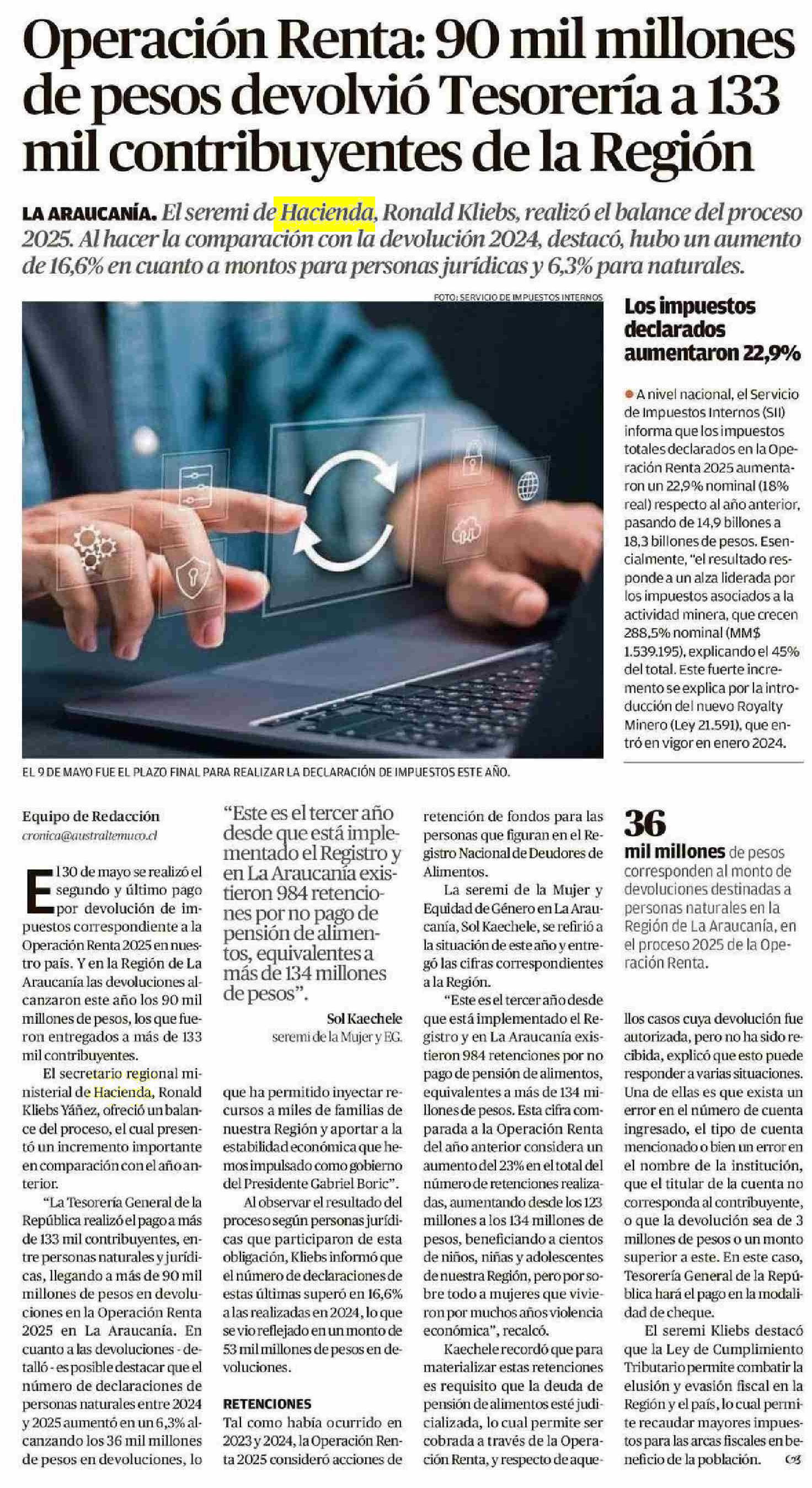 Operación Renta: 90 mil millones de pesos devolvió Tesorería a 133 mil contribuyentes de la Región