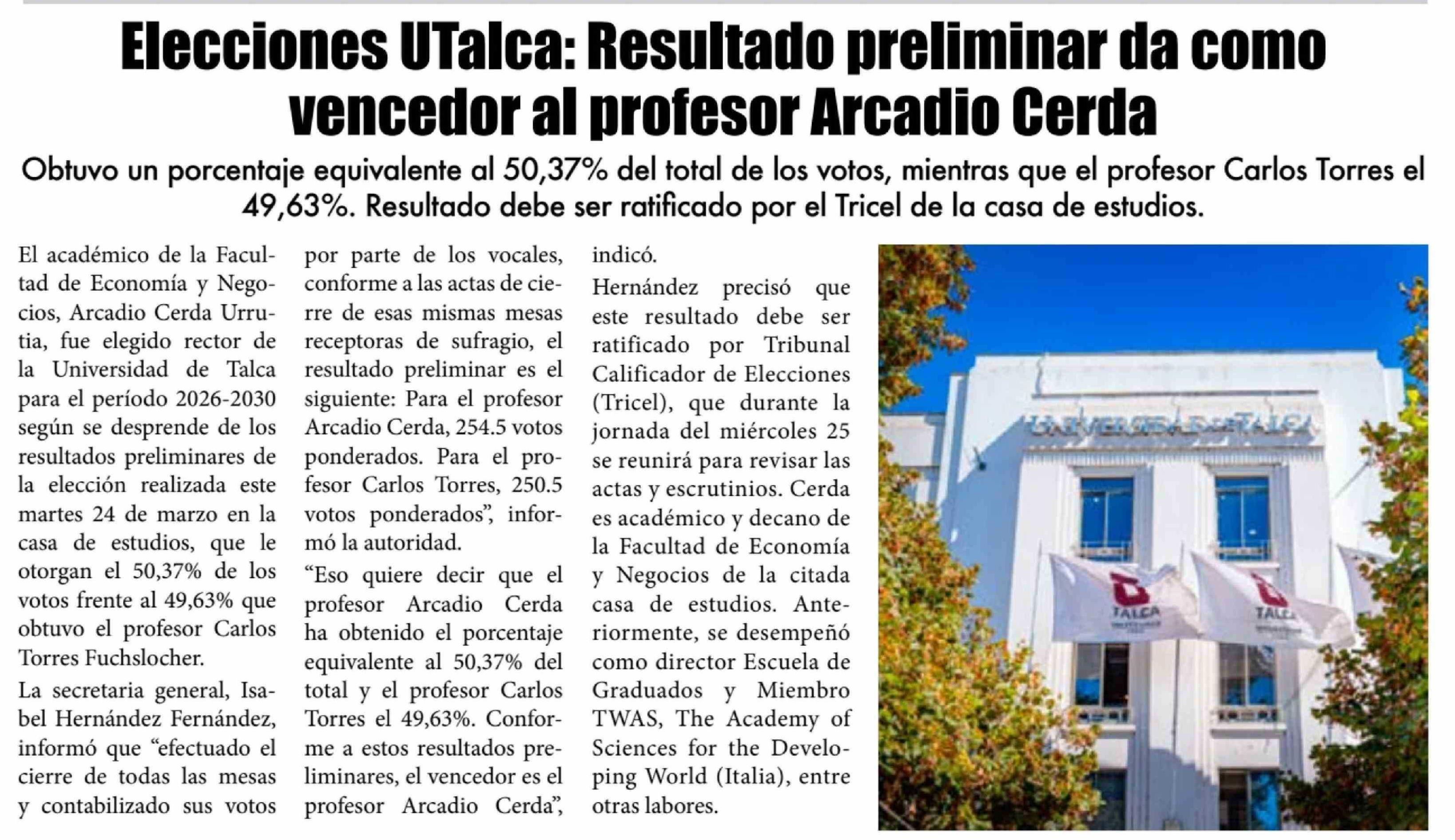 Elecciones UTalca: Resultado preliminar da como vencedor al profesor Arcadio Cerda