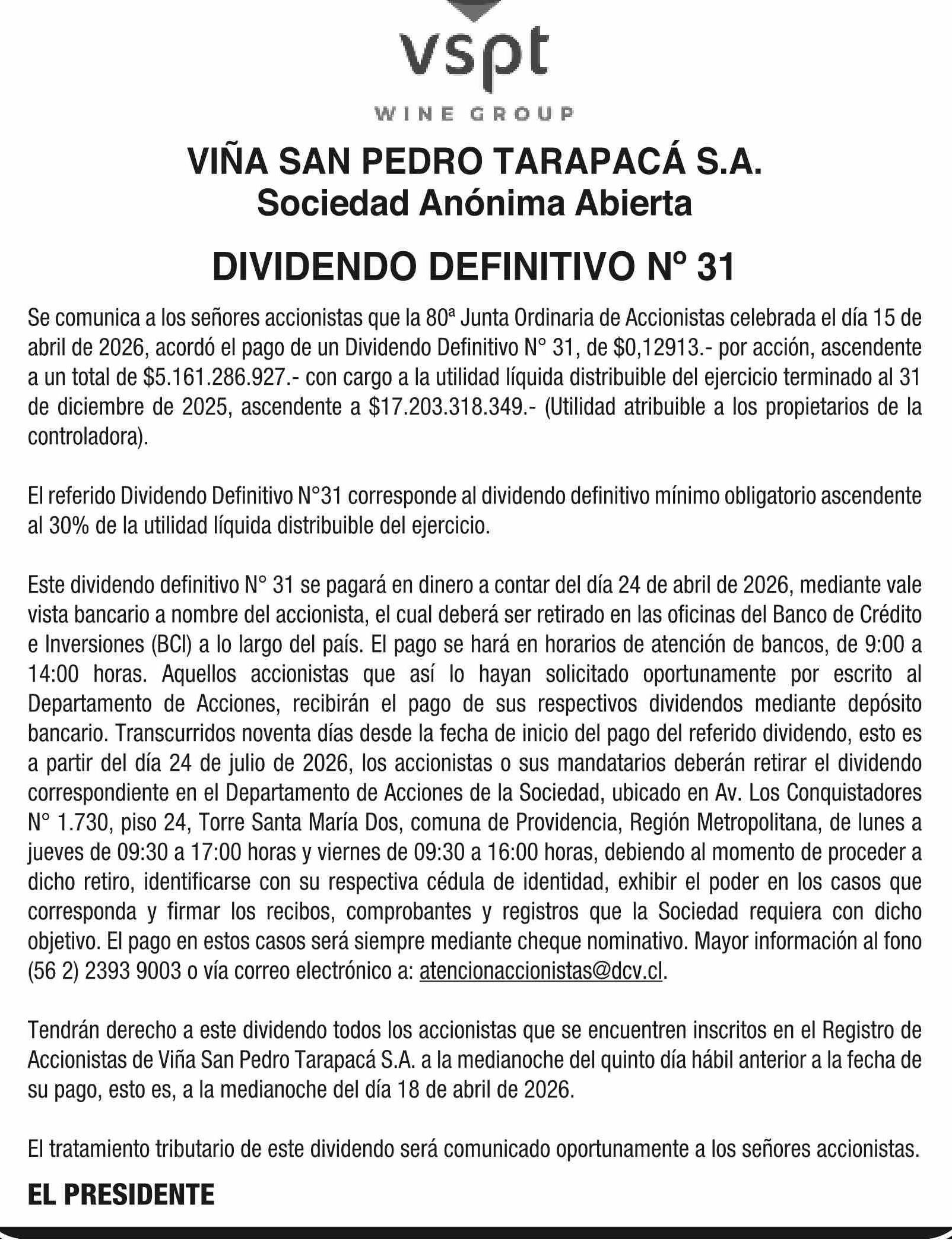 Extractos: VIÑA SAN PEDRO TARAPACÁ S.A.