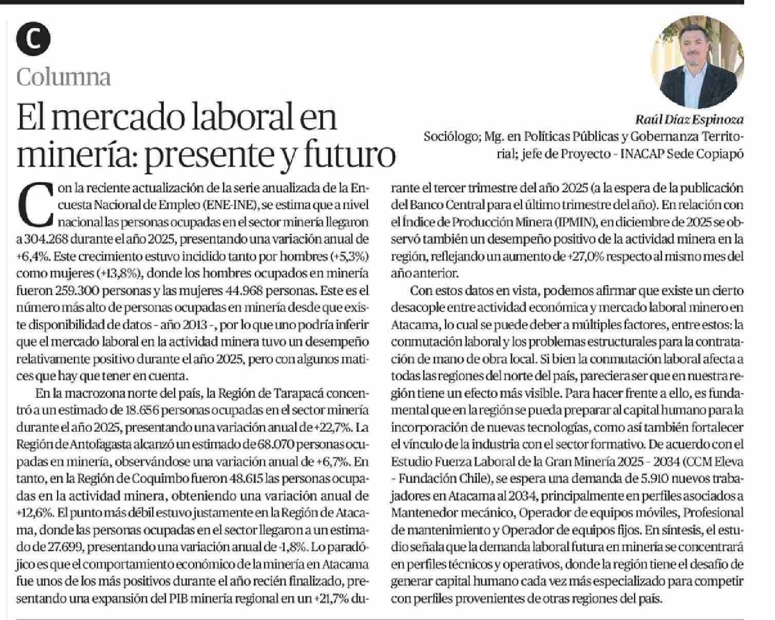 COLUMNAS DE OPINIÓN: El mercado laboral en minería: presente y futuro