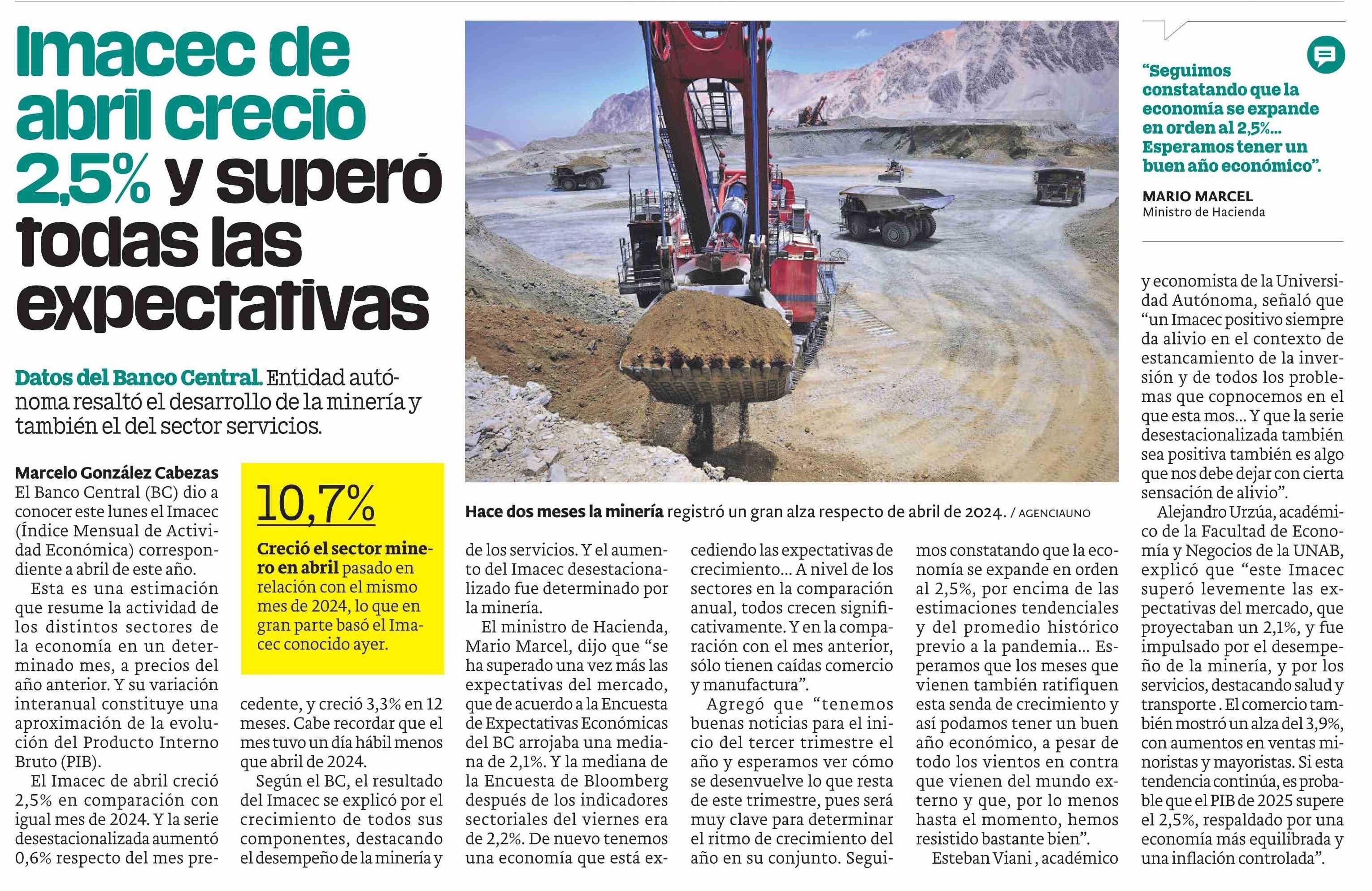 Imacec de abril creciò 2,5% y superó todas las expectativas