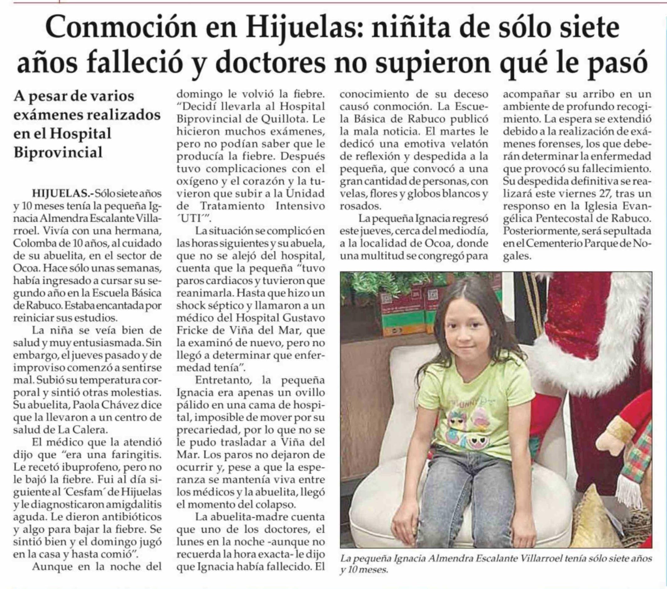 Conmoción en Hijuelas: niñita de sólo siete años falleció y doctores no supieron qué le pasó