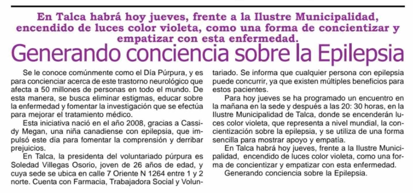 Título: En Talca habrá hoy jueves, frente a la Ilustre Municipalidad, encendido de luces color violeta, como una forma de concientizar y empatizar con esta enfermedad. Generando conciencia sobre la Epilepsia