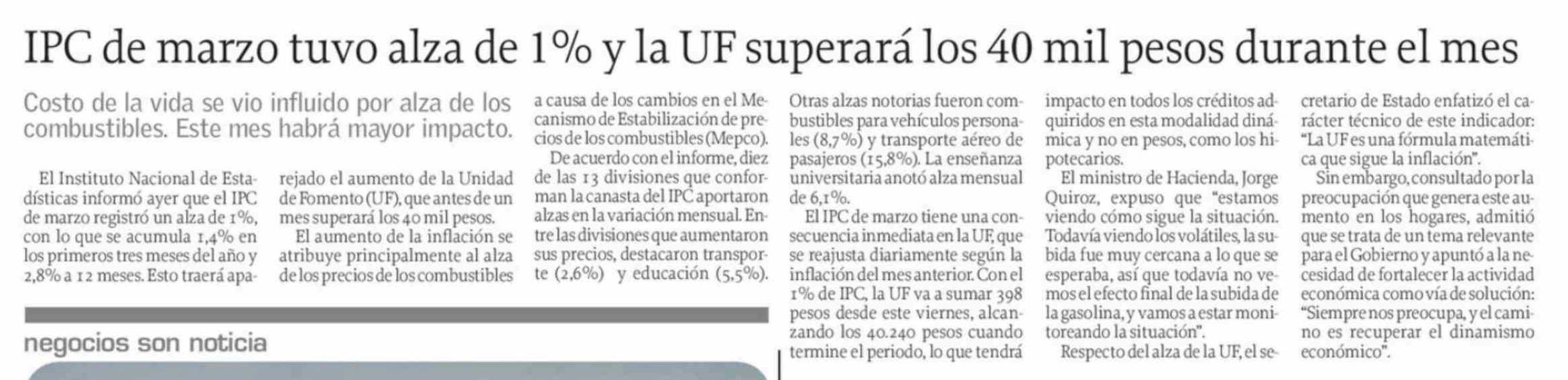 IPC de marzo tuvo alza de 1% y la UF superará los 40 mil pesos durante el mes