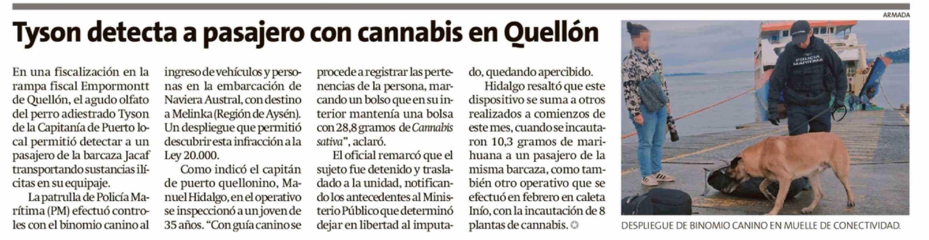 Tyson detecta a pasajero con cannabis en Quellón