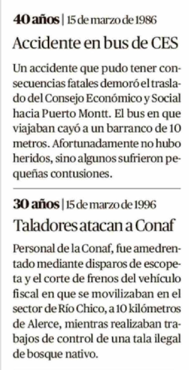 | Título: | 40 años | 15 de marzo de 1986 Accidente en bus de CES Un accidente que pudo tener consecuencias fatales demoró el traslado del Consejo Económico y Social hacia Puerto Montt. El bus en que viajaban cayó a un barranco de 10 metros. Afortunadamente no hubo heridos, sino algunos sufrieron pequeñas contu |