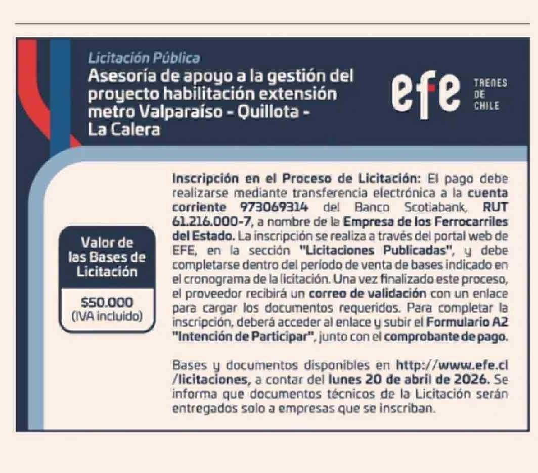 | Título: | AVISO LICITACIONES: EMPRESA DE FERROCARRILES DEL ESTADO. Asesoría de apoyo a la gestión del proyecto habilitación extensión metro Valparaíso - Quillota - La Calera |