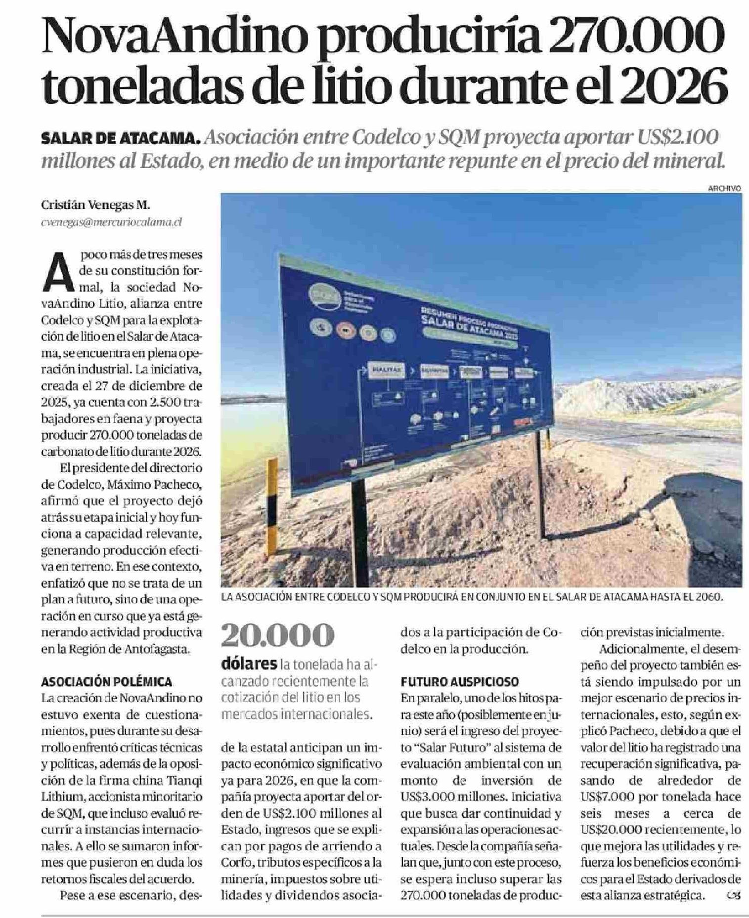 Título: NovaAndino produciría 270.000 toneladas de litio durante el 2026
