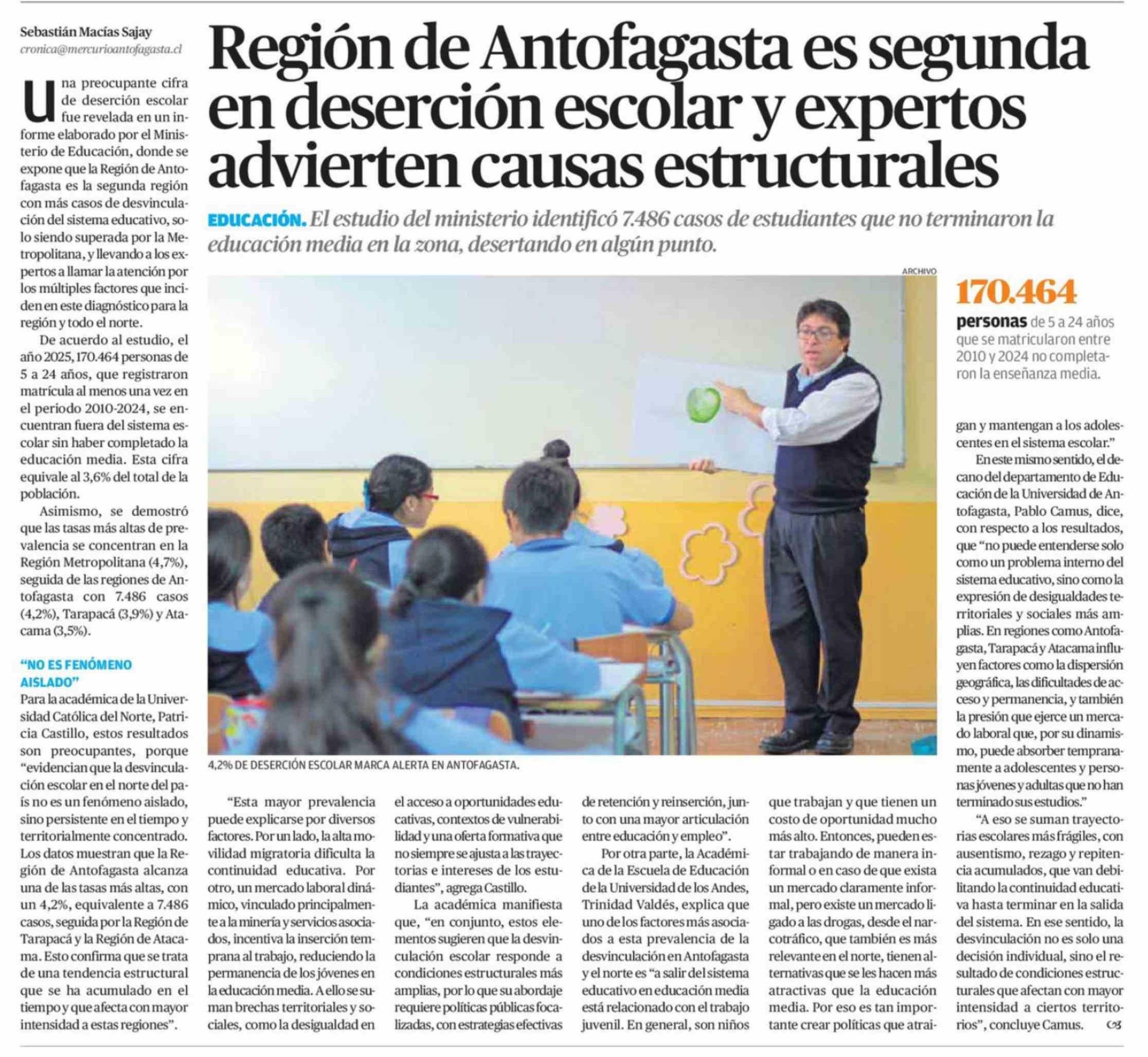 Región de Antofagasta es segunda en deserción escolar y expertos advierten causas estructurales
