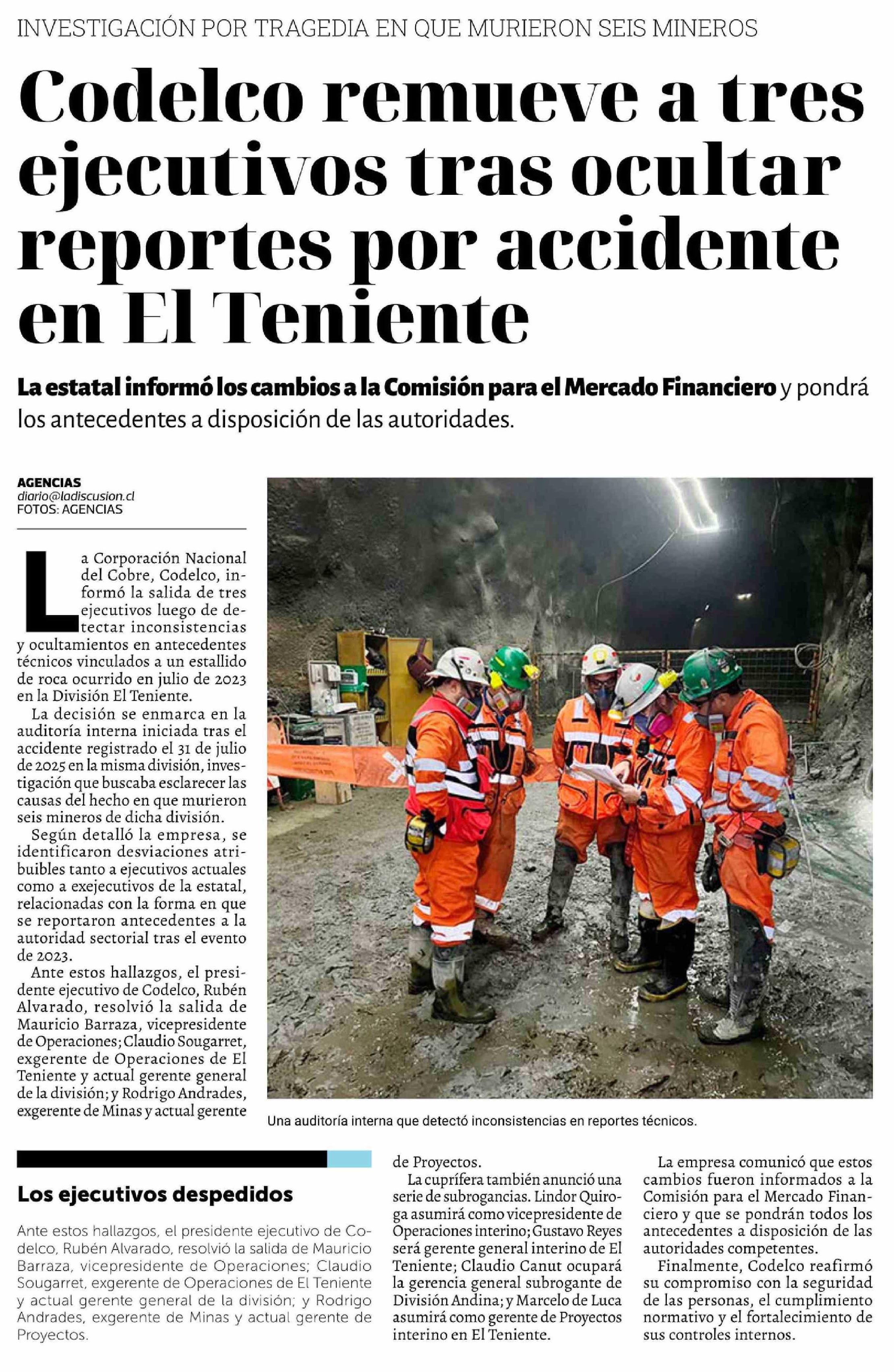 Codelco remueve a tres ejecutivos tras ocultar reportes por accidente en El Teniente