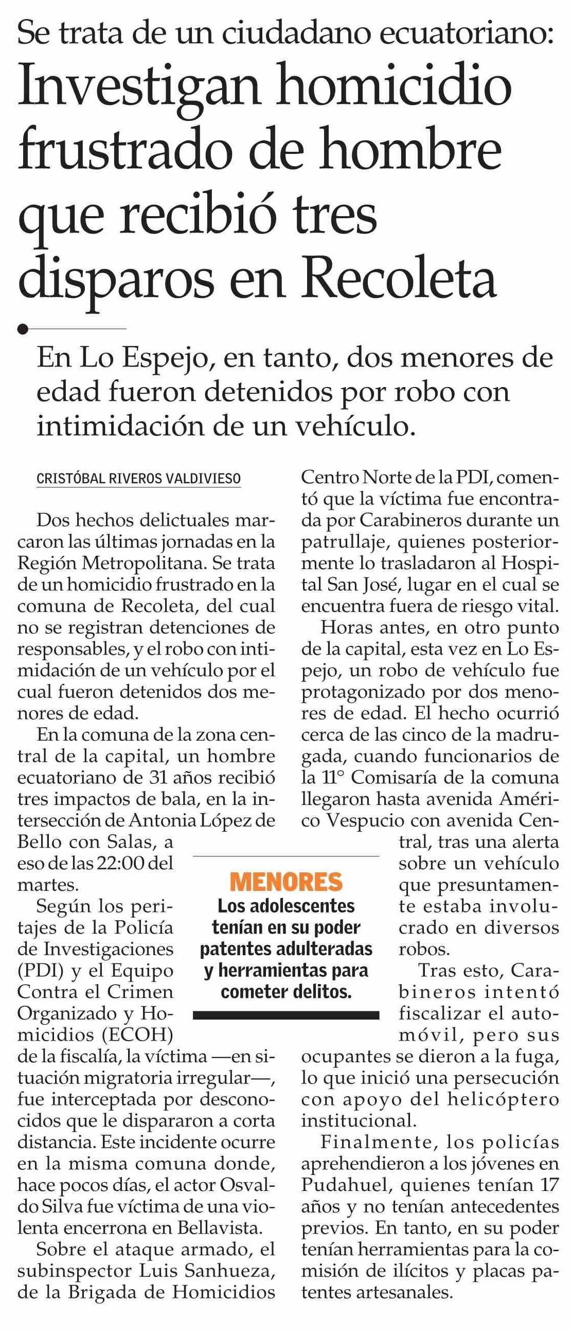 Investigan homicidio frustrado de hombre que recibió tres disparos en Recoleta