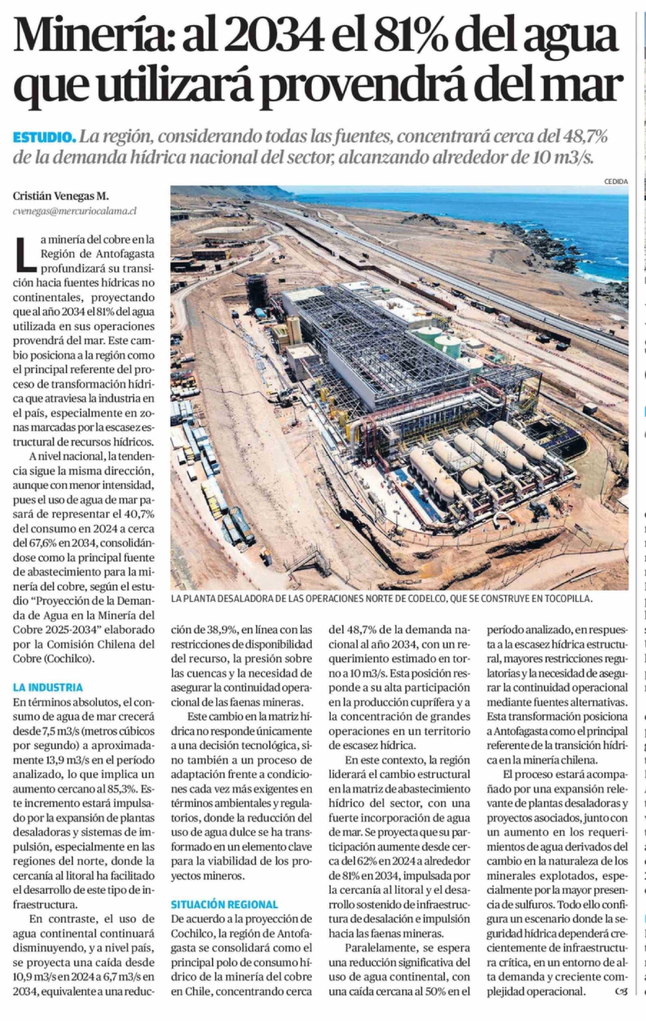 Minería: al 2034 el 81% del agua que utilizará provendrá del mar