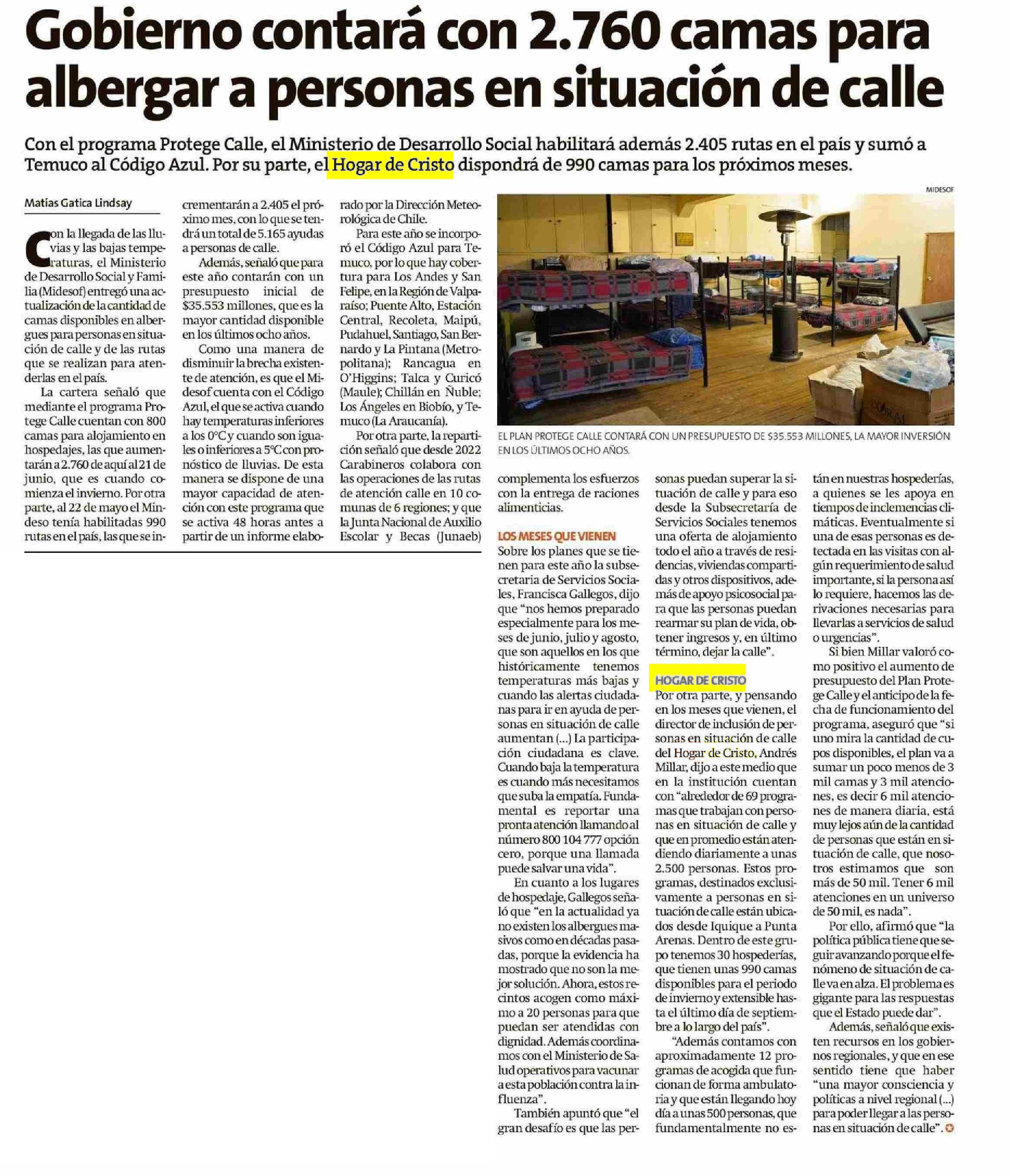 Gobierno contará con 2.760 camas para albergar a personas en situación de calle