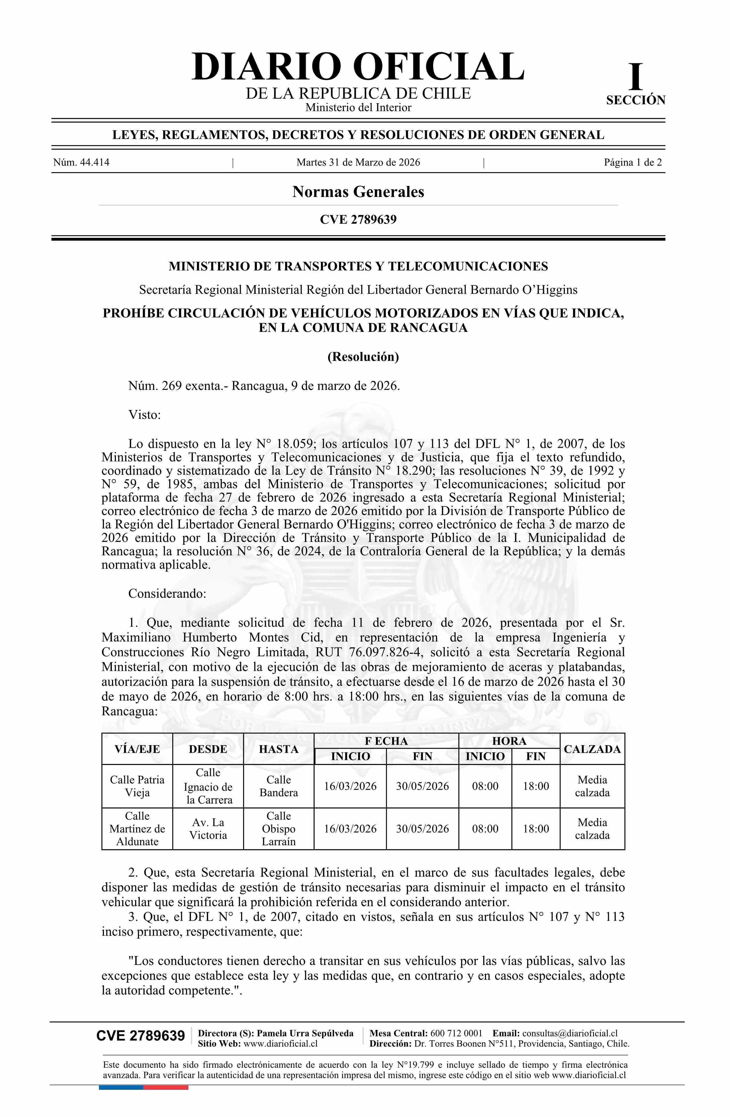 | Título: | Resolución exenta número 269, de 2026.- Prohíbe circulación de vehículos motorizados en vías que indica, en la comuna de Rancagua |