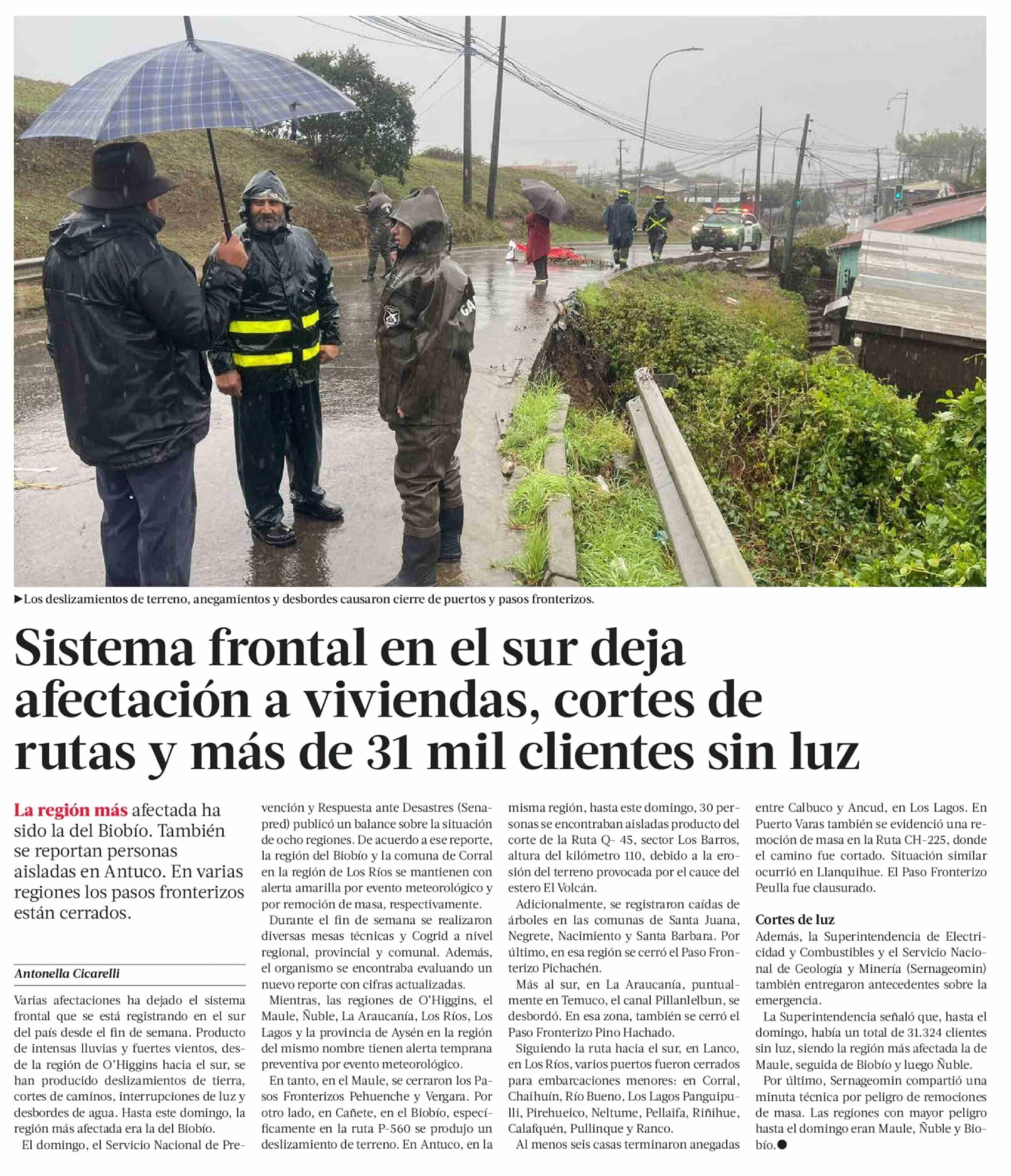 Título: Sistema frontal en el sur deja afectación a viviendas, cortes de rutas y más de 31 mil clientes sin luz