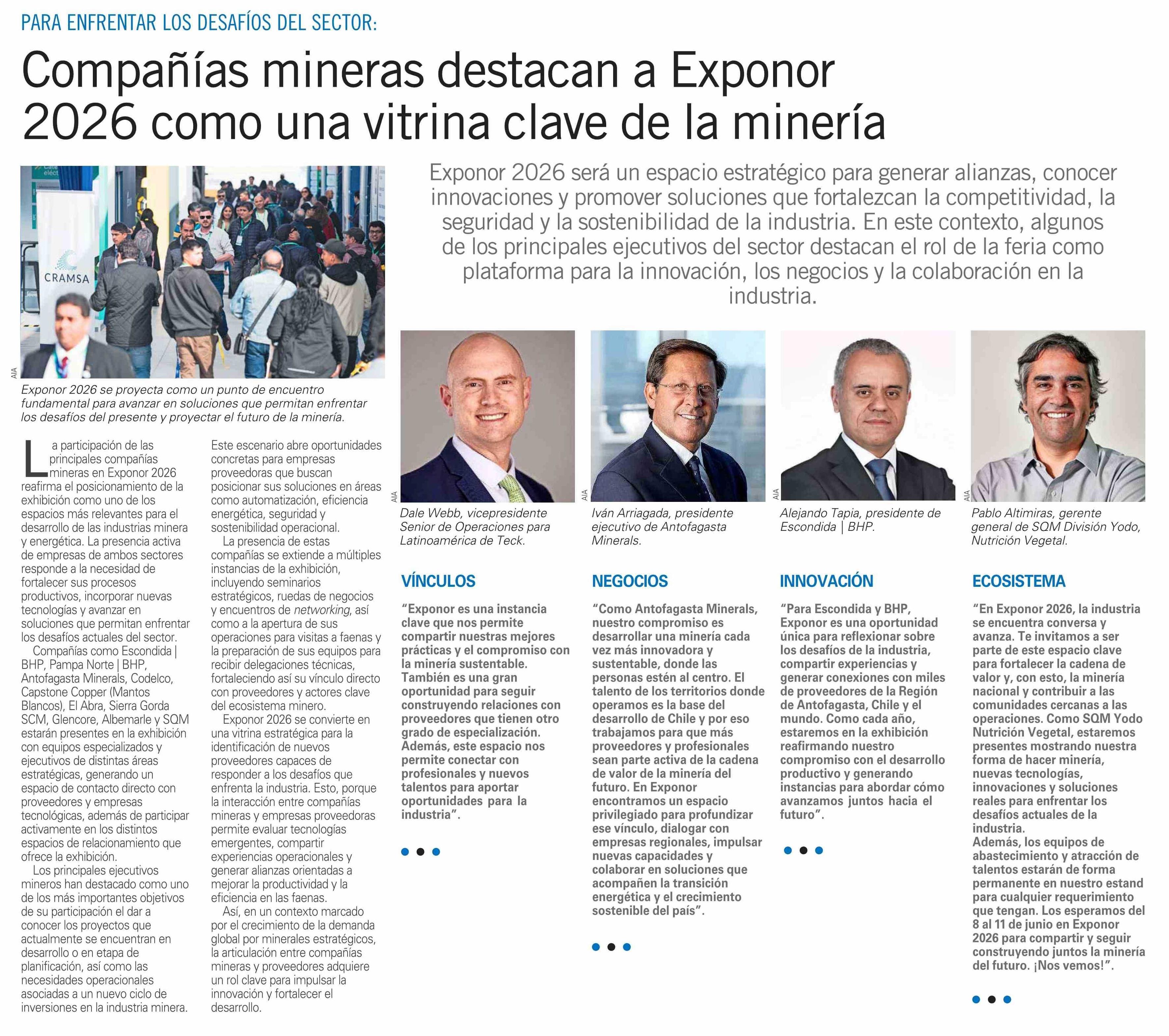 Compañías mineras destacan a Exponor 2026 como una vitrina clave de la minería