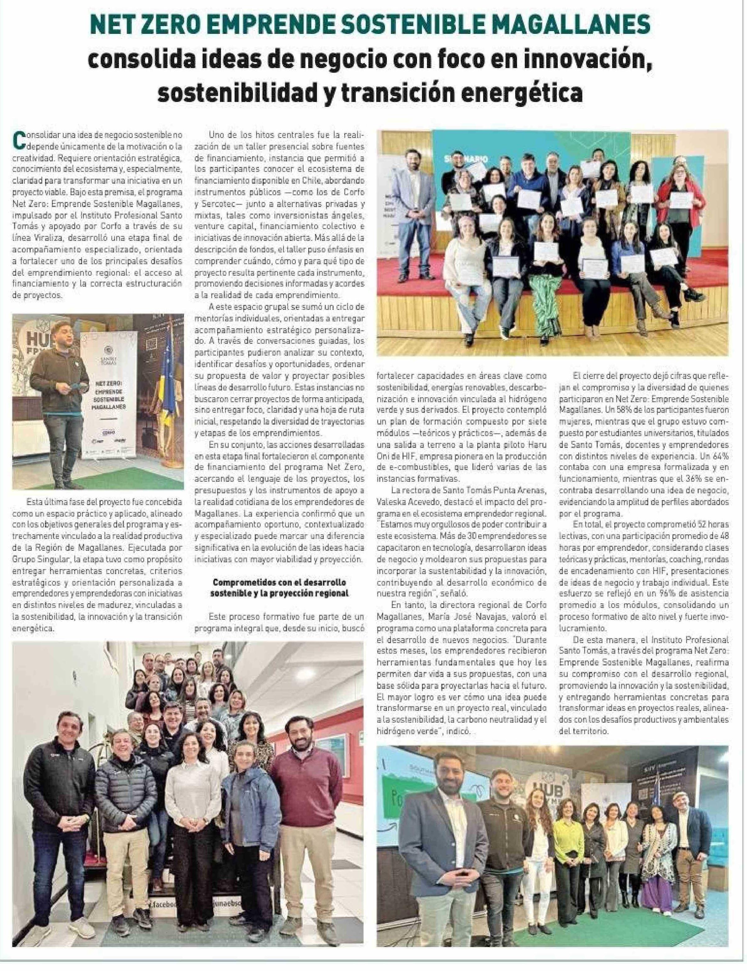 | Título: | NET ZERO EMPRENDE SOSTENIBLE MAGALLANES consolida ideas de negocio con foco en innovación, sostenibilidad y transición energética |