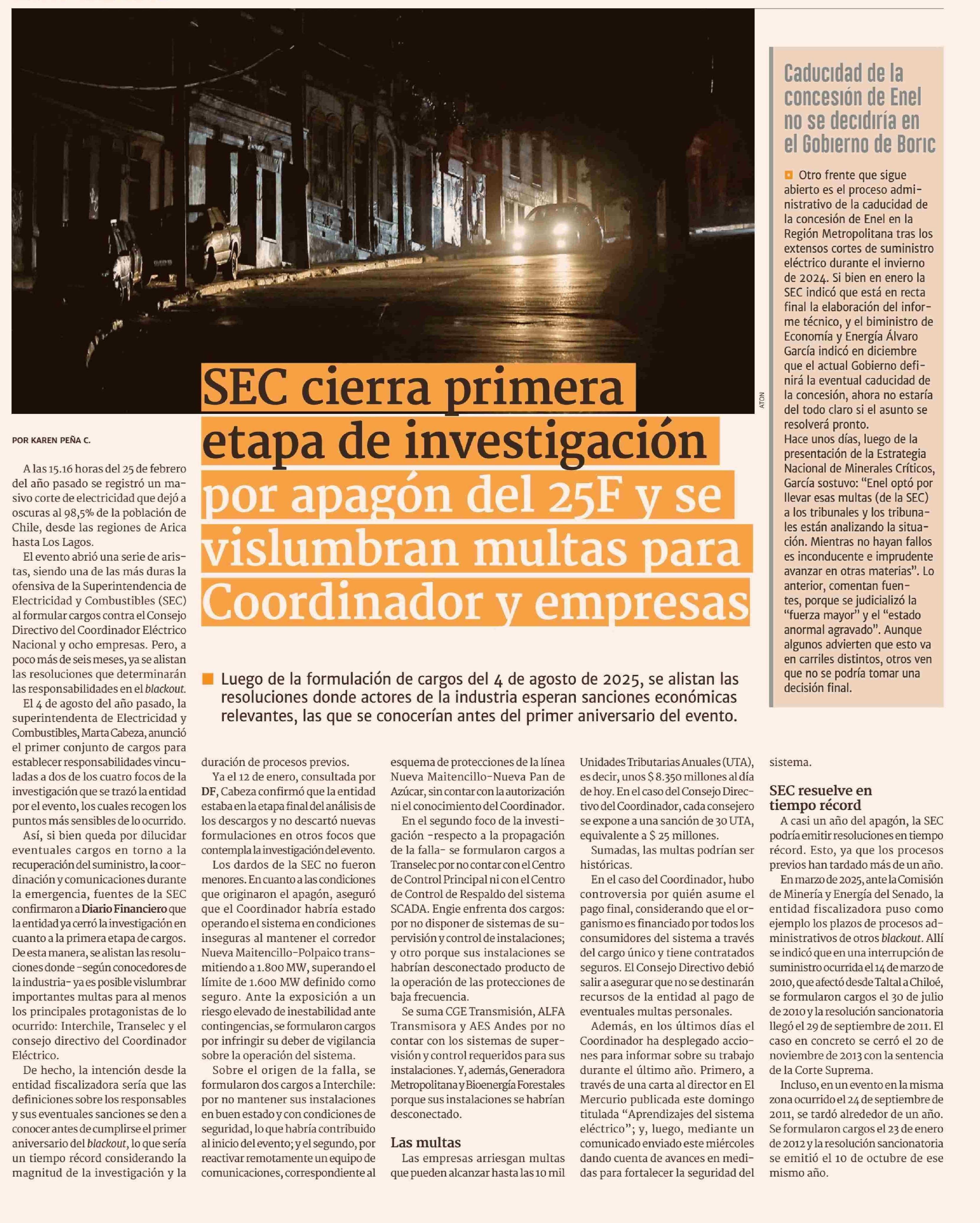 SEC cierra primera etapa de investigacion por apagón del 25F y se vislumbran multas para Coordinador y empresas