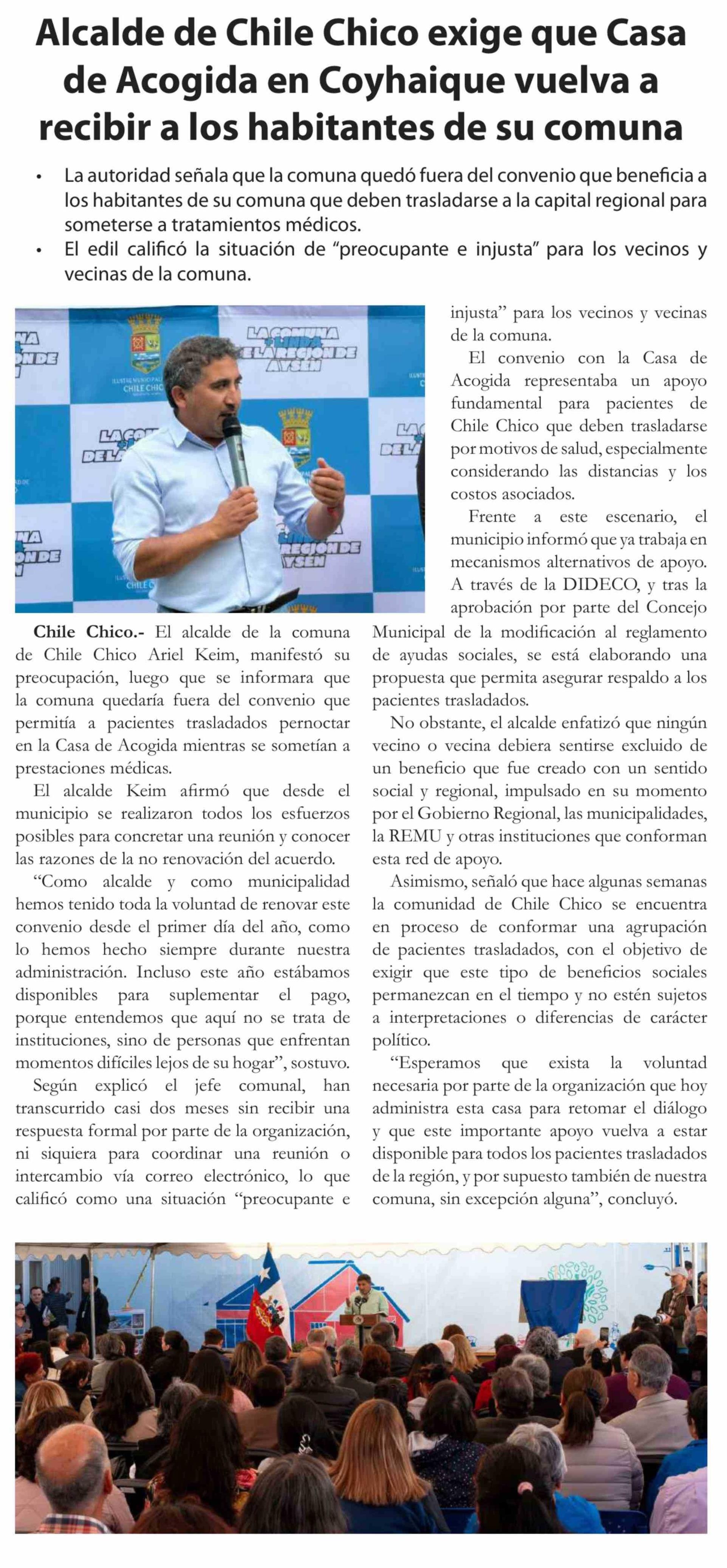 Alcalde de Chile Chico exige que Casa de Acogida en Coyhaique vuelva a recibir a los habitantes de su comuna